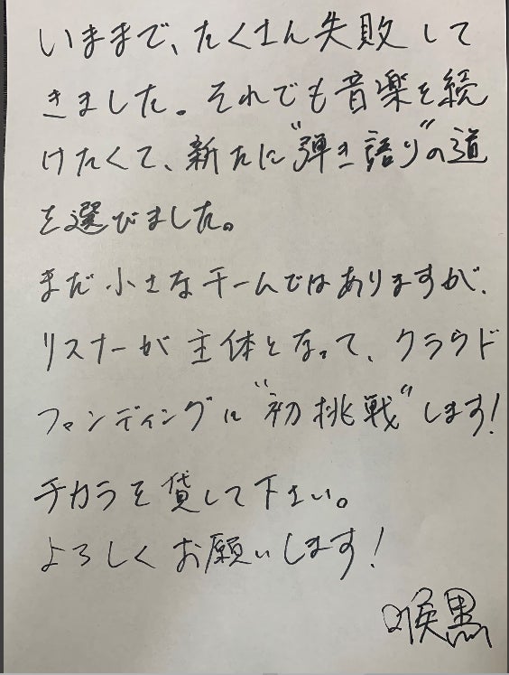 2019/12/27 10:25おはようございます大変長らくお待たせ致しましたお待ちかねのリターンがもうすぐお手元にお届けすることが出来ます。 CD含むをご支援頂いた方 全員に喉黒一さんからの手書きメッセージが届けられます。お一人お一人、心を込めてメッセージを書き添えました。お楽しみ下さい。 もっと見る