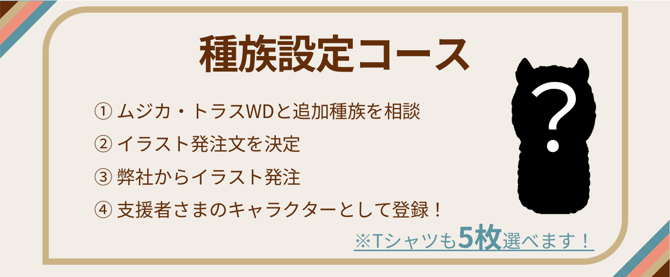 CF限定で、ムジカ・トラスWD(ワールド・ディレクター)が担当する"ワールド0"において、支援者さまが希望する種族について数値・設定などを調整し、問題がなければ作成することが可能です。種族の設定などについてはムジカ・トラスWDと協議して行います。この時、公序良俗や著作権に反する内容については対応できませんこと、予めご了承ください。