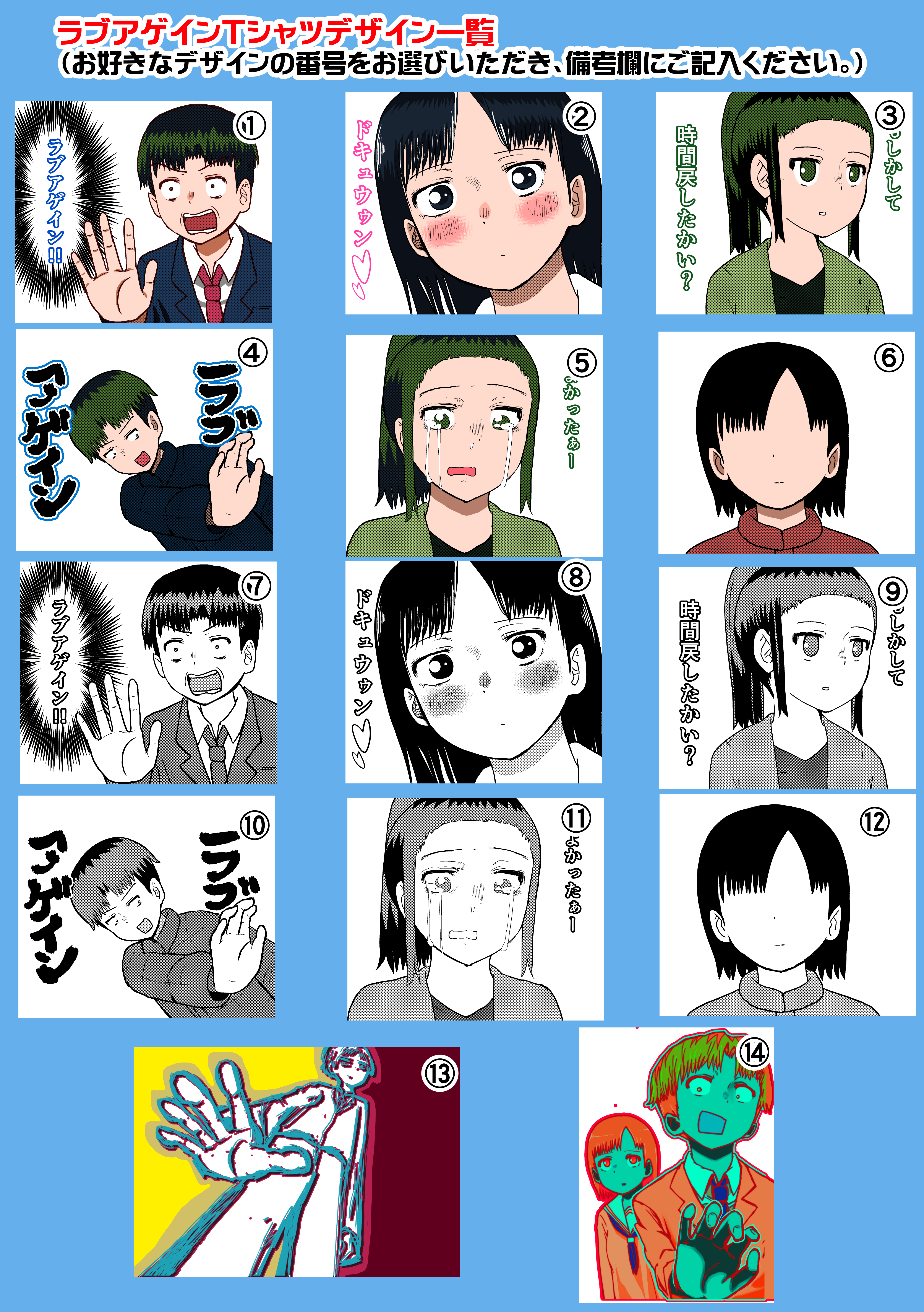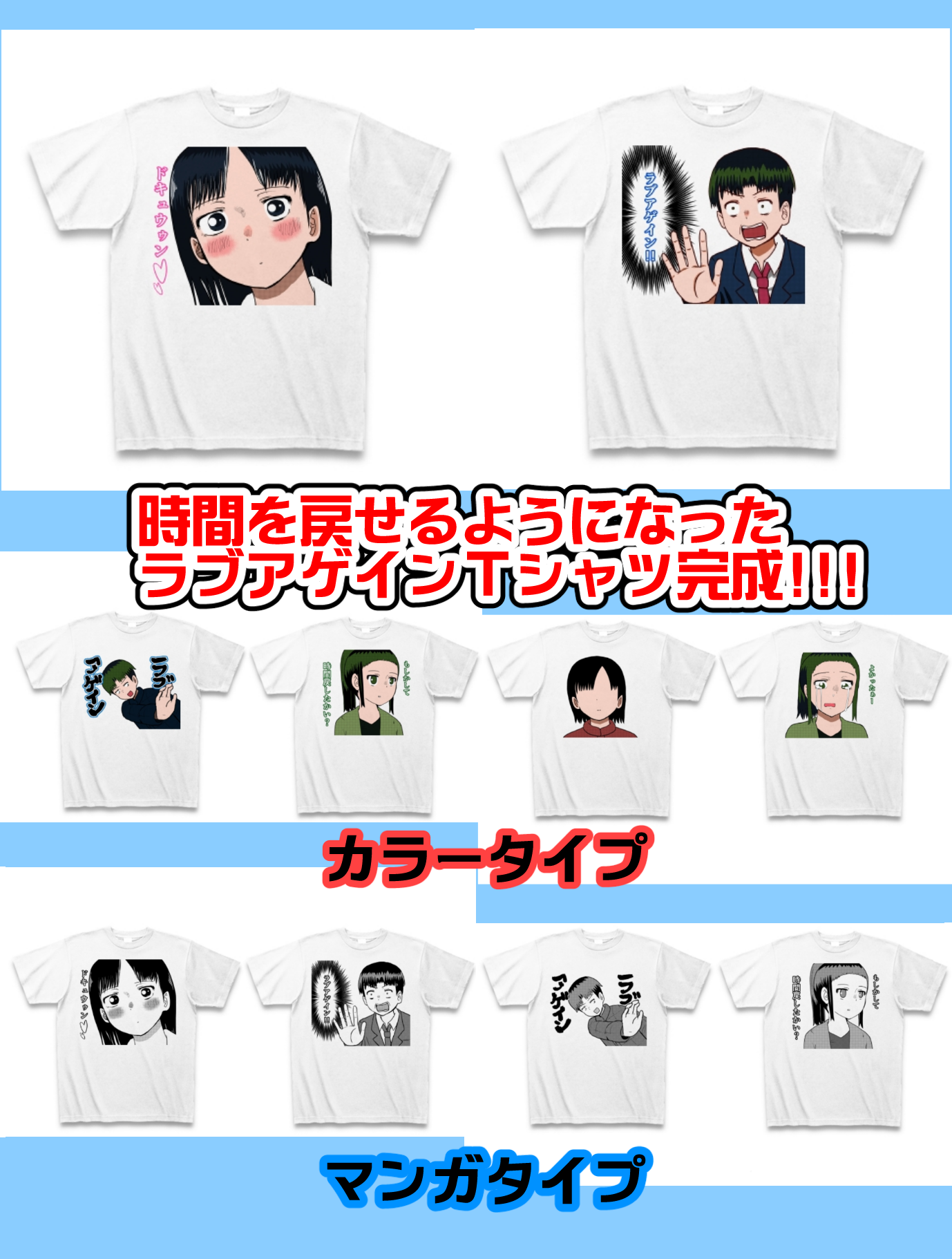50000プラン 「時間を戻せるようになった」(32p)のPDFデータ+特製缶バッチ+イラストカード+色紙に直筆イラスト+特大ポスター+ラブアゲインTシャツ(デザインは選べます)+卓上カレンダー+あんたが大将優勝トロフィーをご提供。サイン入り書籍の送付。