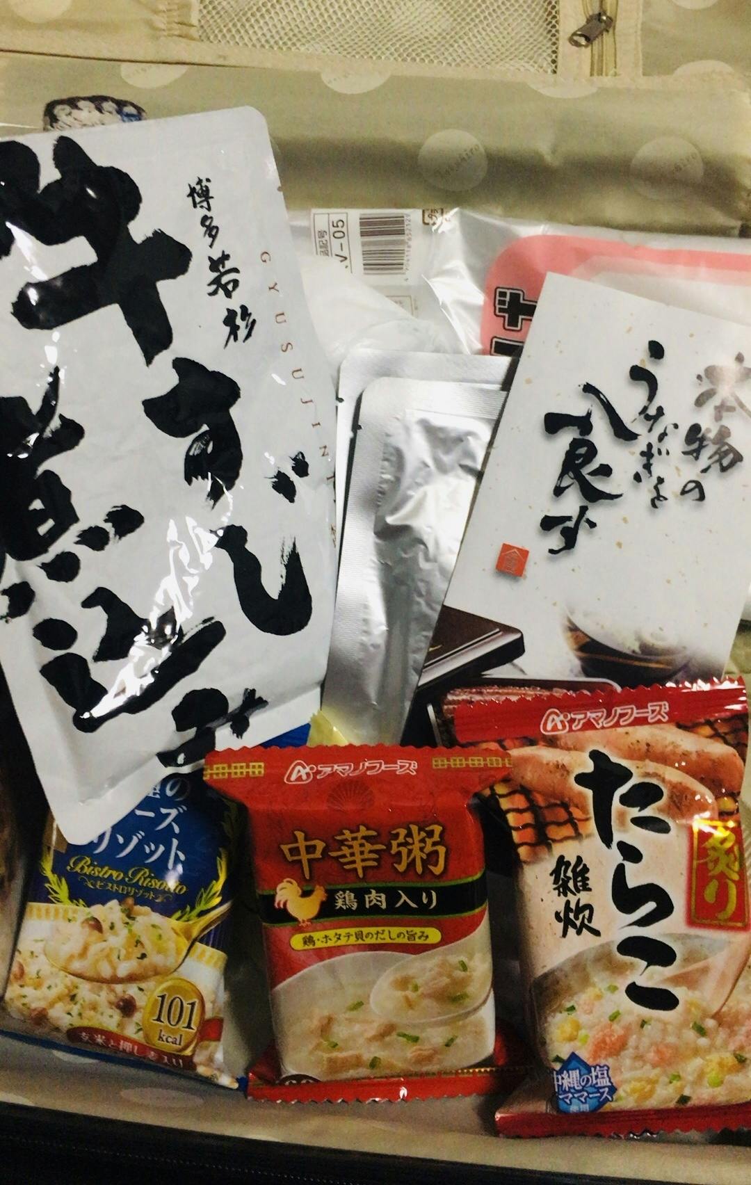 これ以外にも白米数食分とご飯付きの牛丼が入ってて、フリーズドライのリゾットも夜中とか小腹が空いた時に重宝する様に数種類詰め込みました。
