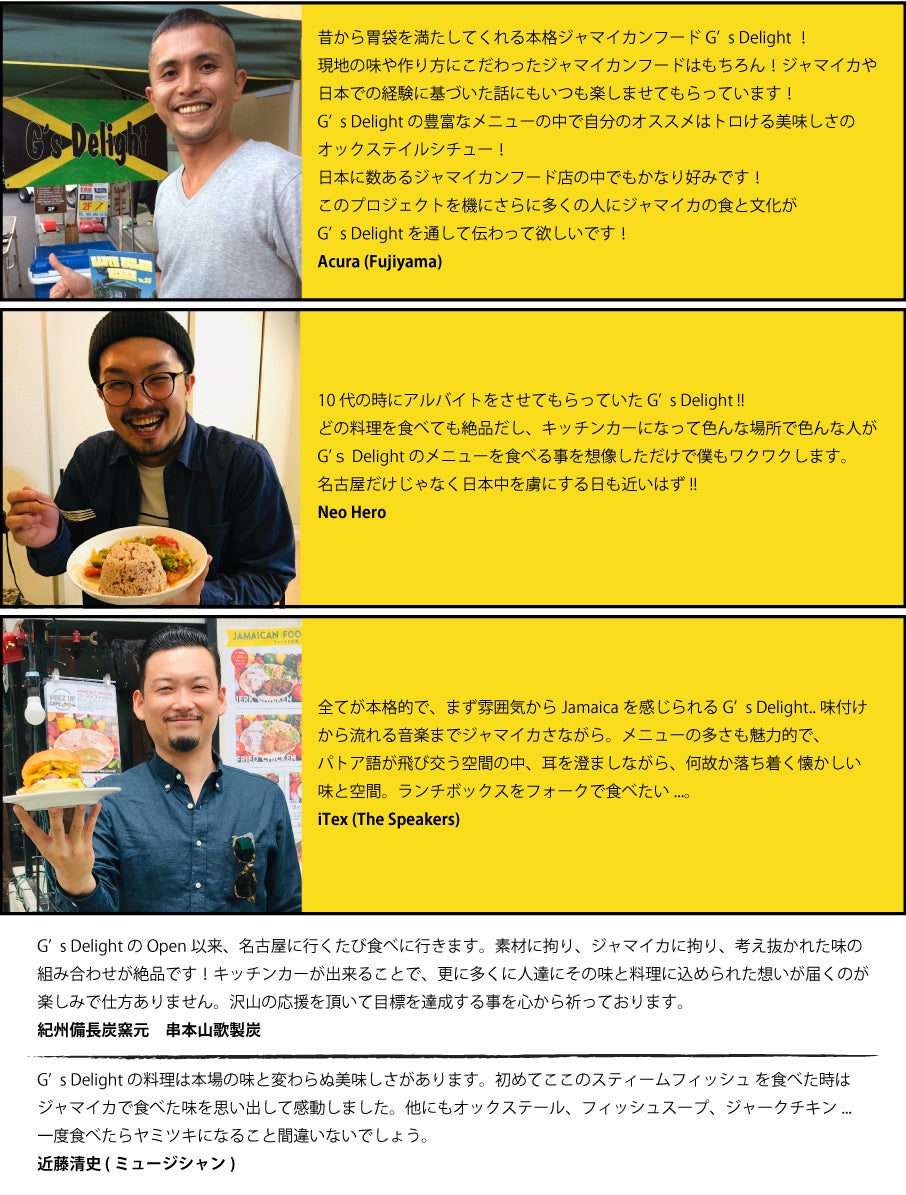 学生の頃のアルバイトで飲食業に携わった経験しかなかった自分が、ジャマイカの文化に触れたことにより、料理を本格的に覚えようという志を持つことが出来ました。私にとってのフード販売はジャマイカの力強さや楽しさを伝える表現方法の一つでもありますが、何よりも 自分が美味しいと思える料理をここ日本で皆様に楽しんでいただく環境を作りたいのです。日本からジャマイカへの渡航者数も増加している昨今、ビジネスとしての更なる可能性も感じています。