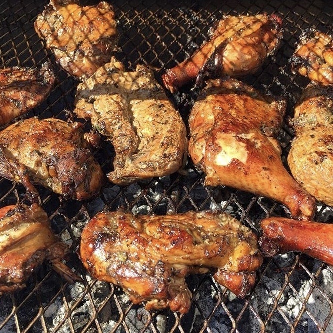 2019/12/15 08:00沢山の方よりお問合わせを頂く「ジャークチキン」まだご存知のない方、食された事のない方も多いようですので、当店の看板メニュー、そしてリターンでも掲載している「ジャークチキン」について、紹介させて下さい。「ジャークチキン」とは、鶏肉を野菜やスパイス、ハーブなどで漬け込み、炭火で焼いたジャマイカの郷土料理です。当店では、野菜ソムリエが厳選した数種の国産野菜と、ジャマイカのスパイスを独自にブレンドし、数日寝かせて味をしっかりとしみ込ませています。そして、当店の自慢の一つでもある紀州の最高級備長炭を使い、ドラム缶のグリルで焼き上げていきます。カリッとスモークされた表面に、ジューシーなお肉、スパイシーな味と香りが食欲をそそります。低カロリー高たんぱく質で、しっとり柔らかい「ムネ」さらにジューシーで食べ応えのある「モモ」ケチャップを添えてジャークチキンを提供されているお店も多いですが、当店の「ジャークチキン」は、野菜、フルーツ、スパイス等を煮込んだトマトベースのオリジナルソースをかけてお召し上がりいただきます。砂糖は不使用で、野菜とフルーツから溶け出た自然な甘みと、ジャマイカの唐辛子であるスコッチボネットの辛みが特徴です。また、着色料も使用していないため、野菜本来の色味のみで仕上げております。辛いものがお好きな方に大好評の、特製のスコッチボネット・ホットペッパーソースは、独特なフルーティな香りが辛さと相まって、更に食欲を増進させてくれます。「ジャークチキン」だけでなく、様々なジャマイカ料理にも相性が抜群です。付け合わせには、フェスティバルという揚げパンやオリジナルドレッシングを使ったサラダをどうぞ。スパイシーな「ジャークチキン」の箸休めのような役割をしてくれます。スパイスとバニラが香るほんのり甘いフェスティバルは、単品で追加注文されるお客様も多い人気商品です。お子様にも喜んで頂けます。野菜ソムリエが選んだ数種の野菜サラダを美味しく彩るドレッシングもこだわりの一品です。サワーながらもガーリックやオニオンの深い風味をお楽しみ頂けます。当店の「ジャークチキン」は、ジャマイカの伝統的な味にこだわっています。ジャマイカを訪れたことのある方や、ジャマイカ出身の方が本場を思い起こして頂けるメニューの一つです。最近ではここ日本にも沢山の「ジャークチキン」を提供するお店がございますので、是非食べ比べてみてください。より多くの皆さまに当店の「ジャークチキン」を食べて頂ける日を心待ちにしています。Bless Up! もっと見る