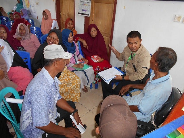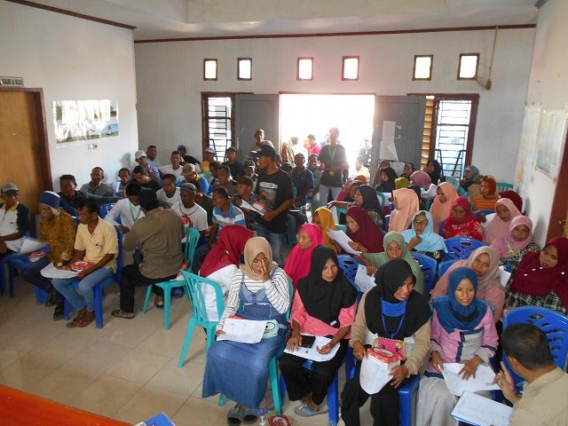 現地スタッフの説明に真剣に耳を傾ける住民たち。