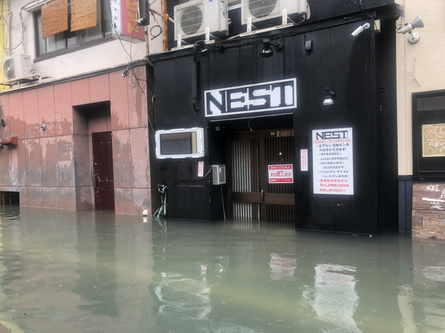 令和元年8月28日、佐賀は豪雨災害に見舞われ、NESTがある通りもひざ上まで冠水し、店内も1階は客席がひざ下まで、厨房およびカウンター内は道路と同程度の水位まで浸水してしまいました。