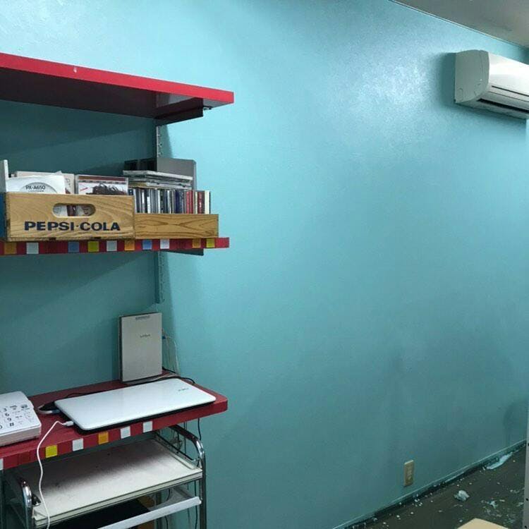 今まで真っ白だった壁4面を、この#トキワパーラーのテーマカラーに塗り替えが完成!