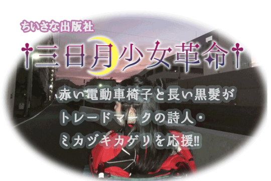 はじめまして。赤い電動車椅子と長い黒髮がトレードマークの詩人・ミカヅキカゲリの作品をお送りするためのちいさな出版社*† 三日月少女革命 †です。