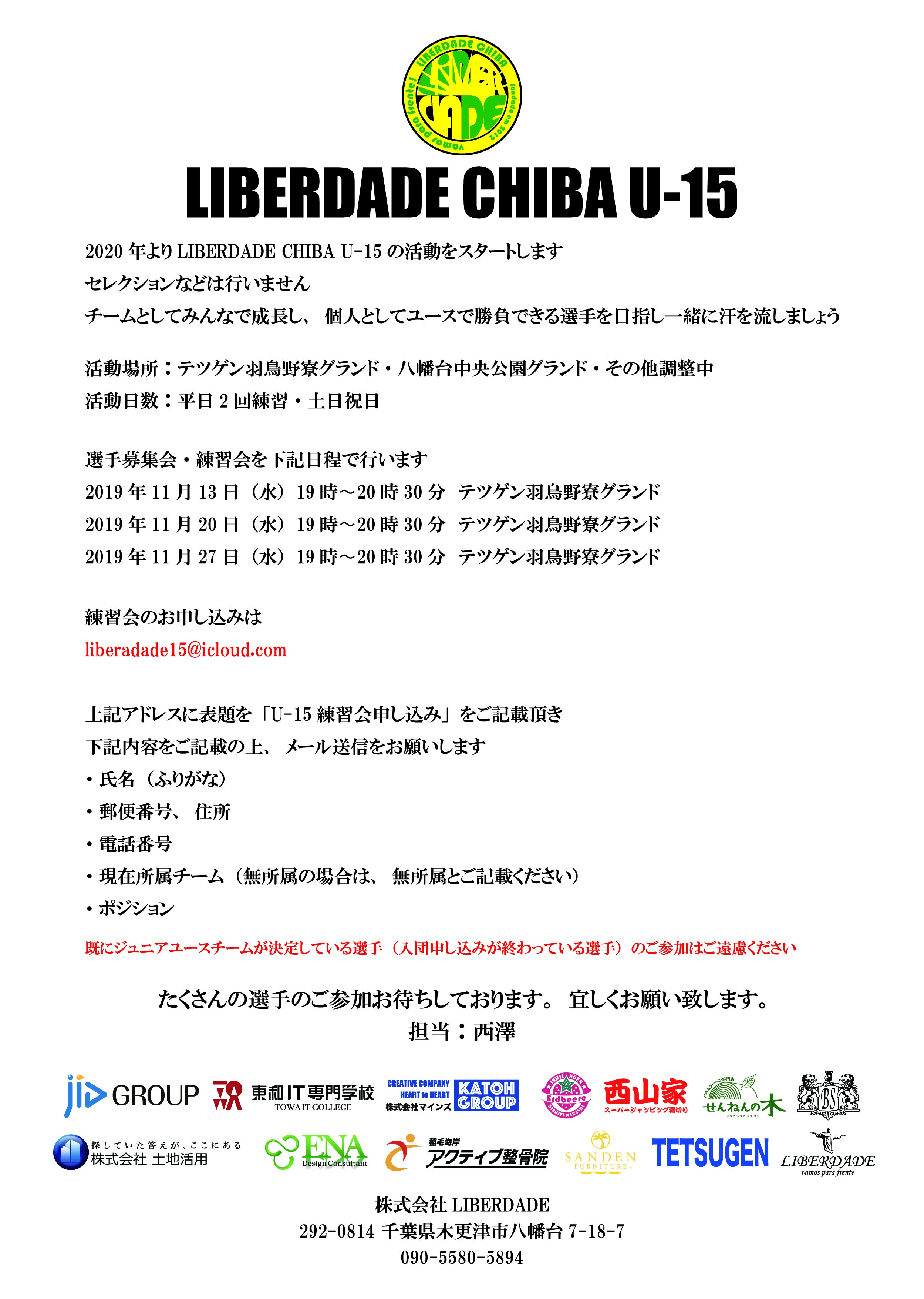【LIBERDADE CHIBA U-15 練習会参加者募集】2020年より活動を始めるLIBERDADE CHIBA U-15の一期生募集練習会を下記の日程で開催します。会場:テツゲン羽鳥野寮グランド日程:2019年11月13.20.27日(水) 19:00〜20:30参加費:無料セレクションは行いません。チームとしてみんなで成長し、個人としてユースで勝負できる選手を目指し一緒に汗を流しましょう!練習会のお申込みはliberdade15@icloud.com上記メールアドレスに必要事項をご記載の上、メールを送信下さい。メール表題「U-15練習会申込み」・氏名(ふりがな)・郵便番号、住所・電話番号・現在所属チーム(無所属の場合無所属と)・ポジションたくさんのご参加お待ちしております。宜しくお願い致します。LIBERDADE CHIBAhttps://www.liberdade-chiba.net