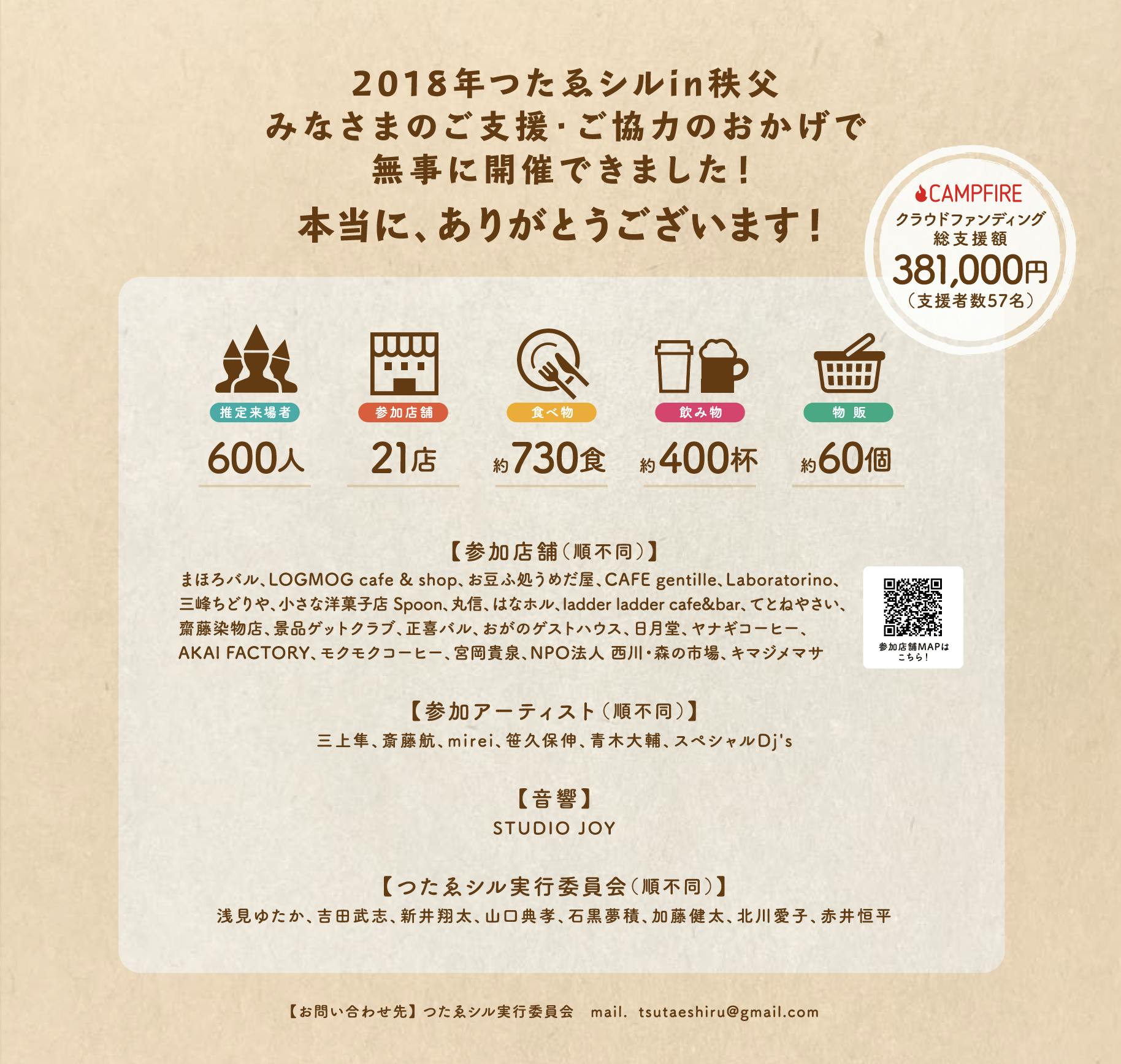 昨年、秩父市の羊山公園にて、誰でも入場無料で楽しめる全く新しいフェス「つたゑシル」を開催。想像をはるかに超えた数のお客さんにお越しいただき、本当に素敵なイベントにすることができました。ありがとうございました!
