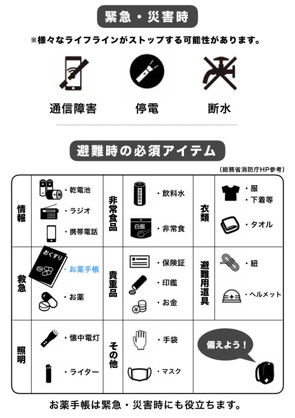 もし、電子お薬手帳を使用する場合、必ず1冊は紙媒体のお薬手帳を持ち、定期的にお薬情報等をアップデートをし、避難時に持ち出すべきアイテムとして準備をしていただければ嬉しいです。