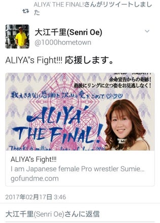支援して下さるパトロンの皆様、ありがとうございますm(_ _)m 参戦メンバーが決まりましたのでご報告までm(_ _)m 〜数えきれない感謝と沢山の愛を込めて〜 【亜利弥'引退興行】 【日時】2017年4月7日 金曜日【場所 】新宿FACE【開場時間】18時【試合開始】19時 ◎〈チケット〉税込・最前列 ¥10000・カウンター席 ¥10000・S席2.3列目 ¥8000・A席 ¥5000*当日¥500 up*飲み物代金別途 ¥500 ◎参戦選手•亜利弥'選手•ジャガー横田選手(ディアナ) •ダンプ松本選手(フリー)•田中将斗選手(ZERO1)•伊藤薫選手(ディアナ)•ドレイク森松選手(ガッツワールド)•ジミークネス J.K.S.選手、(dragon gate)•葛西純選手(FREEDOMS)•怨霊選手(666)•ミスモンゴル選手(世界プロレス協会)•藪下めぐみ選手(フリー)•ケン片谷選手(CMA東京)•くいしんぼう仮面選手(フリー)•政宗選手(フリー)•木藤裕次選手(ASUKA PROJECT)•佐野直選手(プロレス佐野魂)•藤田ミノル選手(フリー)•鈴木鼓太郎選手(フリー)•紫雷イオ選手(スターダム)•坂井澄江選手(フリー)•賀川照子(西口プロレス) ・リングアナウンサー 高杉二郎・4/7大会統括 味方冬樹・レフェリー アンパイア荒田 アメリカで活動している後輩の坂井澄江選手のSNSでの拡散活動のお陰で、アメリカで活動されている大江千里さんからも、SNSとFacebookから直接Messageを頂きました。 応援して下さる皆様に胸が熱くなります。