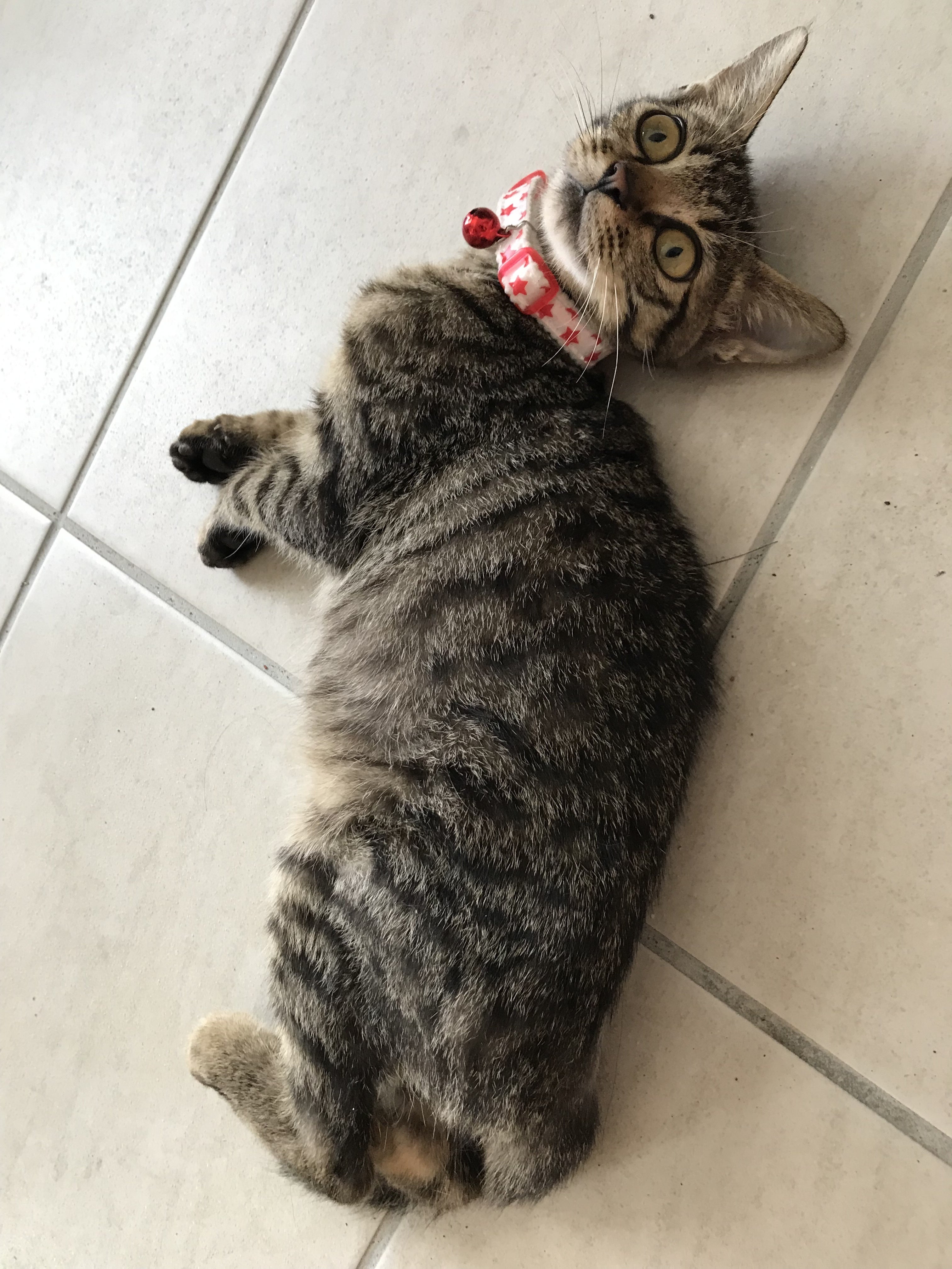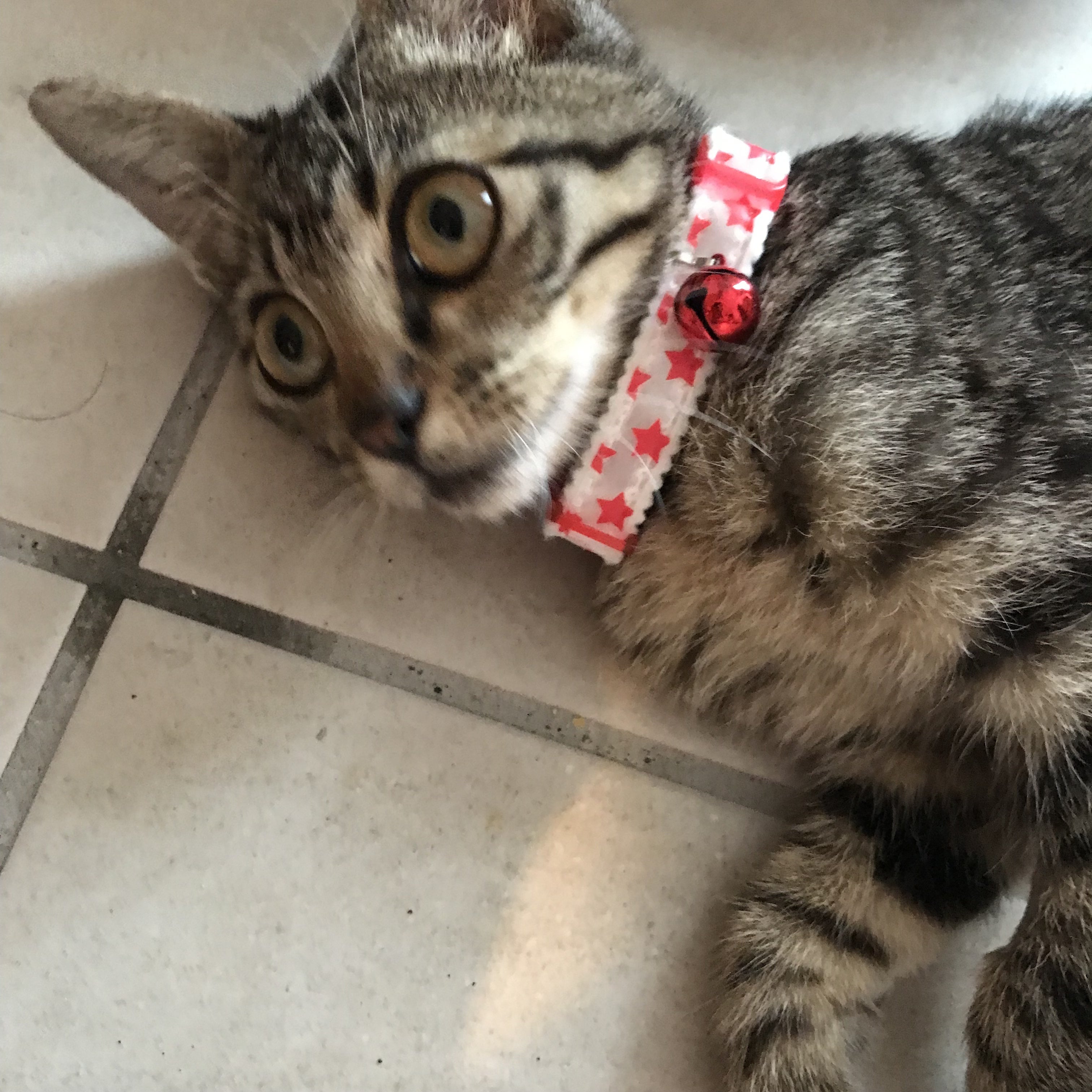 首輪をリニューアルしました!100均で購入した首輪は大きかったので、ちょうど良いサイズのものに変更しました。空気清浄機の横にゲージを置いているからか、鼻水も少しはおさまってます。そして、タカナ君ですが、飼った事がないので普通の猫が分かりませんが、座ってるのが多かったのですが、玄関先に出してあげるとウロウロスリスリゴロゴロと動いてます!!15センチくらいの段差もスチャっと登ります。たまに、怪我した足が突っ張る感じがありましたが、少しずつは良くなってるのではと素人判断ですが、思っております。小さいながらたくさん痛い思い、怖い思いをしてきたので、これからは楽しい幸せニャンコになって欲しいです!明日は抜糸とワクチンに行ってきます!