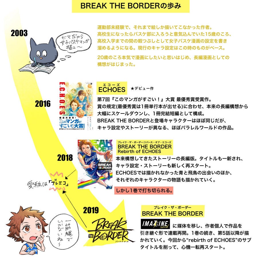 いま世に出ているのは1冊完結短編版である「ECHOES」と、連載化した長編版である本作「BREAK THE BORDER」の第1巻(紙の単行本)だけながら、バスケットボールファンやLGBTQの方々などを中心に、とても熱い支持をいただきはじめています。