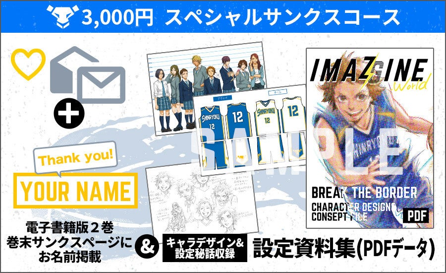 2020/08/10 09:14そろそろお盆シーズンですが、いかがお過ごしでしょうか?歩です。さっそくですがお知らせです。7/31より、BREAK THE BORDERの電子書籍版第1巻がリリースされました!kindleやebookjapan、コミックシーモア ほか約130のストアで配信されます。▶︎kindle: https://www.amazon.co.jp/dp/B08DVFN93X/ref=cm_sw_em_r_mt_dp_cnimFbGVWTSNKスマートフォンやタブレットで、どこでもBREAK THE BORDERをお楽しみください!第1話の冒頭がカラー掲載になっていたりと、電子書籍版ならではの良さもあります。個人的には大きめのタブレット端末で、見開きで読むのがおすすめです◎リリースにあたっての想いはIMAZINEに書かせていただきました。また、第1巻リリースと会社設立記念(今更ですが…)として、SUZURIにて新作グッズを沢山販売開始しました!直前のお知らせになってしまいましたが、明日8/11(火)までTシャツ1000円引きセールも開催中です!▼ショップはこちらからどうぞ▼https://suzuri.jp/aym_imazine一部だけ簡単にご紹介させていただきますと、キャラクターの描かれたシリーズと、シンプルにロゴやバスケットボールのみのデザインのシリーズとがあります。中でもフルグラフィックTシャツは速乾性のある素材で、日常でもスポーツでも着ていただけるのでおすすめです。そのほかグラスやタオルハンカチ・バッグ類など、日常の中にさりげなく取り入れられるものも多数ありますので、お好みでお選びください!ここに書ききれないグッズ一覧情報はこちらにまとまっています。8月中に第8話の配信がスタートしますので、2巻収録分も終盤に近づきつつあります。皆さまのおかげで、1話1話楽しんで描かせていただいてます!今後もお楽しみに! もっと見るリターンの発送に関するお知らせ
