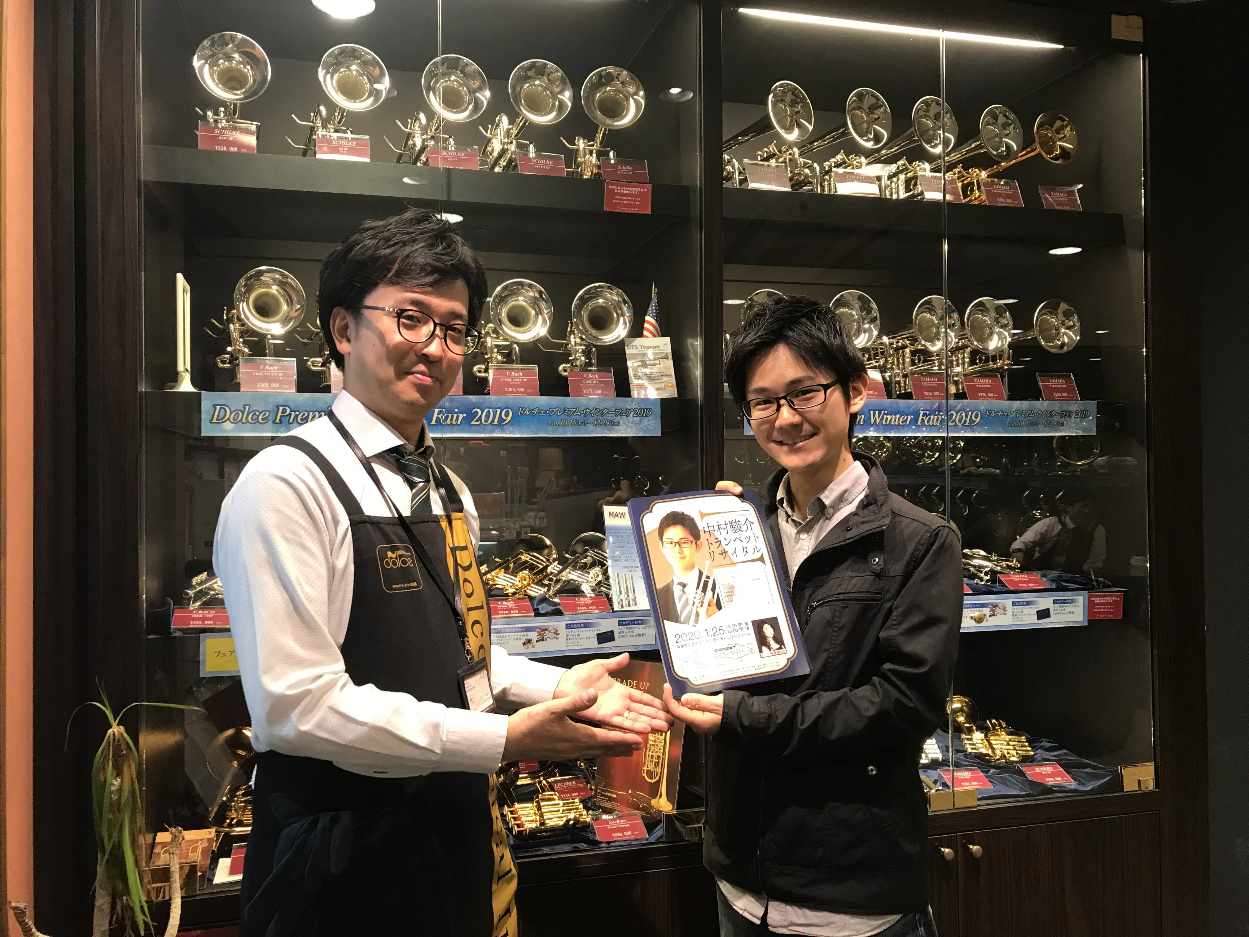 当時からお世話になっている山中さん(写真の男性)とはもうすぐ10年のお付き合いになります。その後もピッコロトランペットを購入させていただいたり、B♭管を買い替えたり、生徒の楽器をいくつも選定させていただきました!