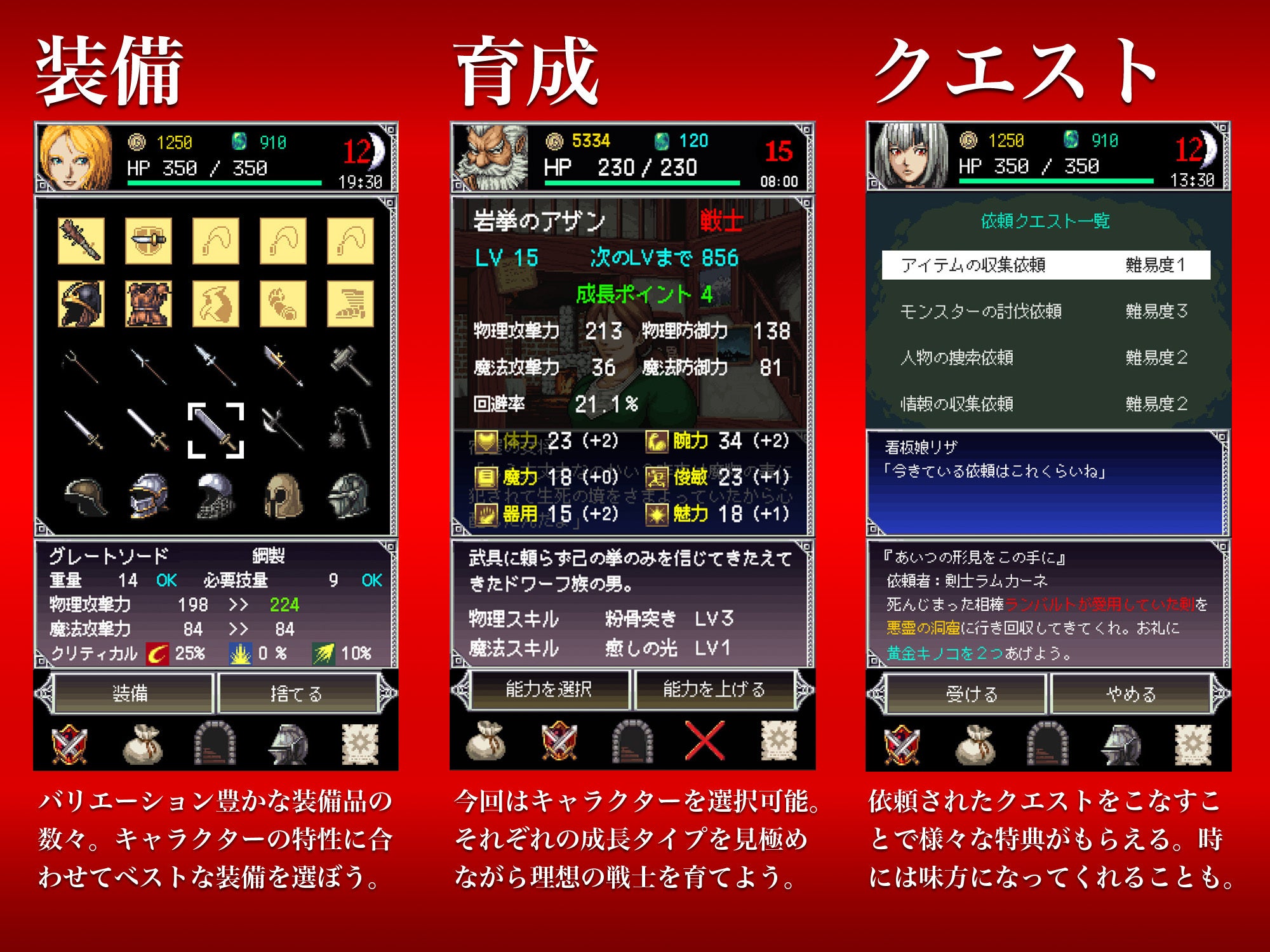 今回はプレイするキャラクターを選ぶことができる。個性的なキャラクターは戦士や魔導師、武闘家など個性豊か。彼らを使用するには依頼された様々なクエストを解決しなければならない。新たに加わった腕力、体力、技量のステータスを鍛えることで俊敏な二刀流騎士や攻撃力重視の重戦士など、自由なキャラクターメイクが可能。