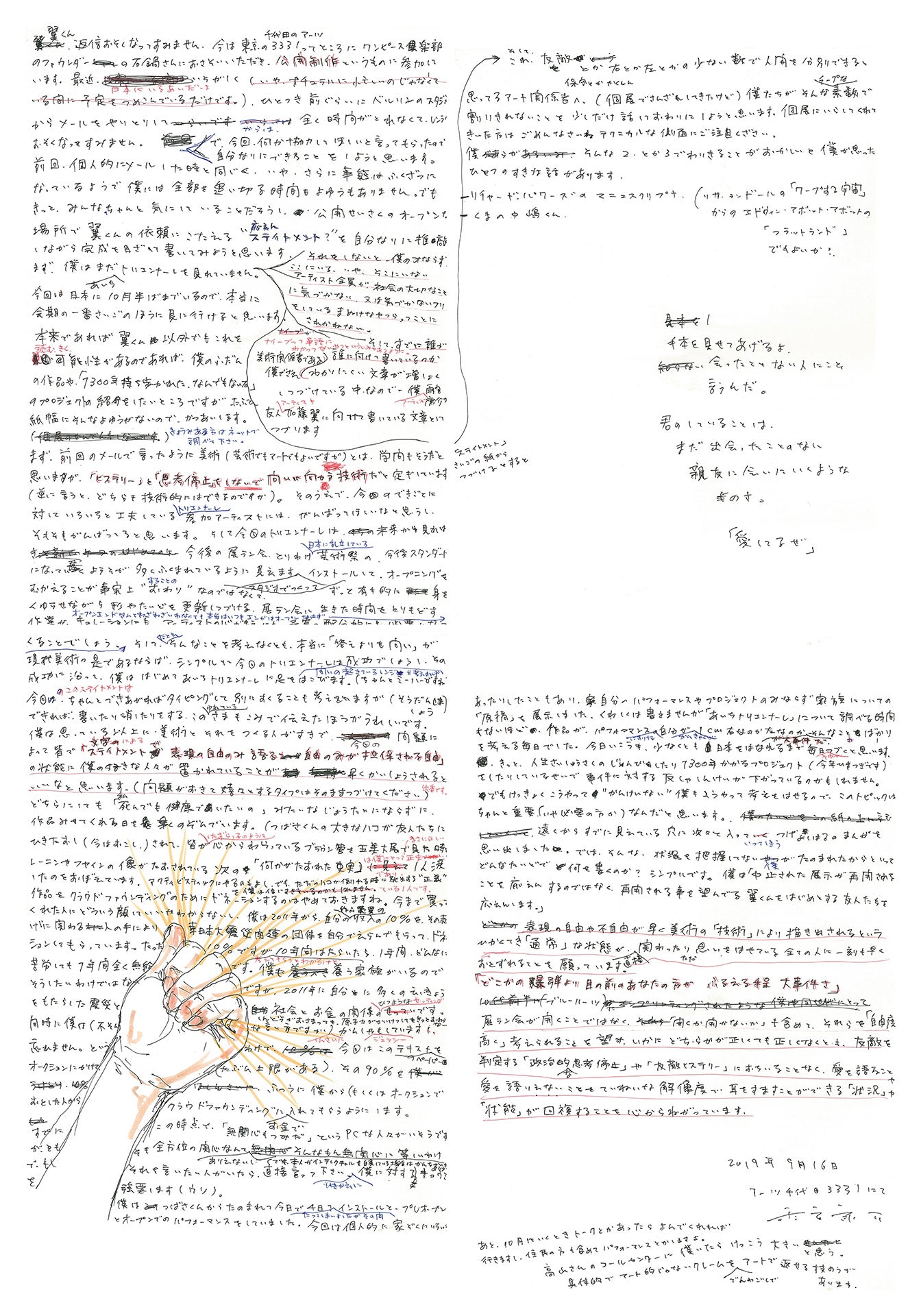 ちょうど頼まれた公開制作の、人が見ている2時間を文章を考えて推敲する時間にあてました。時間が足りなくて乱筆ごめんなさい。終わったと同時にこれを読み上げ、パフォーマンスへと繋げるワンセットを行い(パフォーマンスの内容はご想像ください)、その場で販売し、クラウドファウンディングへの振込をその方に託しました。
