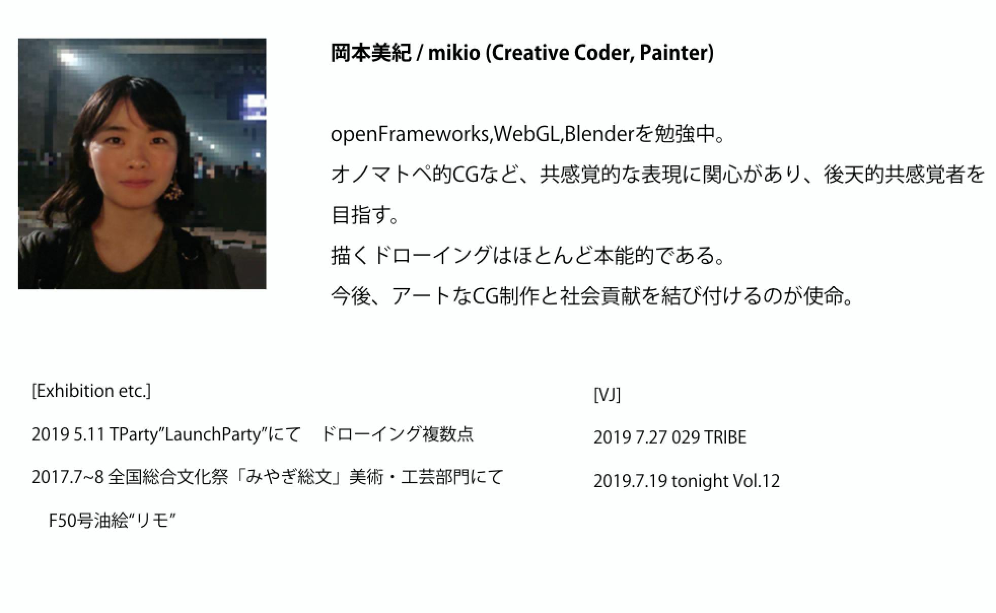 また、弊団体の浪川・奥山を中心にクリエイティブコーディングの普及活動もおこなっています。先日は「クリエイティブコーディング事始め」と称してワークショップを開催致し、openFrameworksを用いた映像表現手法の基本をハンズオン形式で紹介しました。参加者の中には継続的にopenFrameworksで制作した映像作品をSNSに投稿されている方もいらっしゃいます。