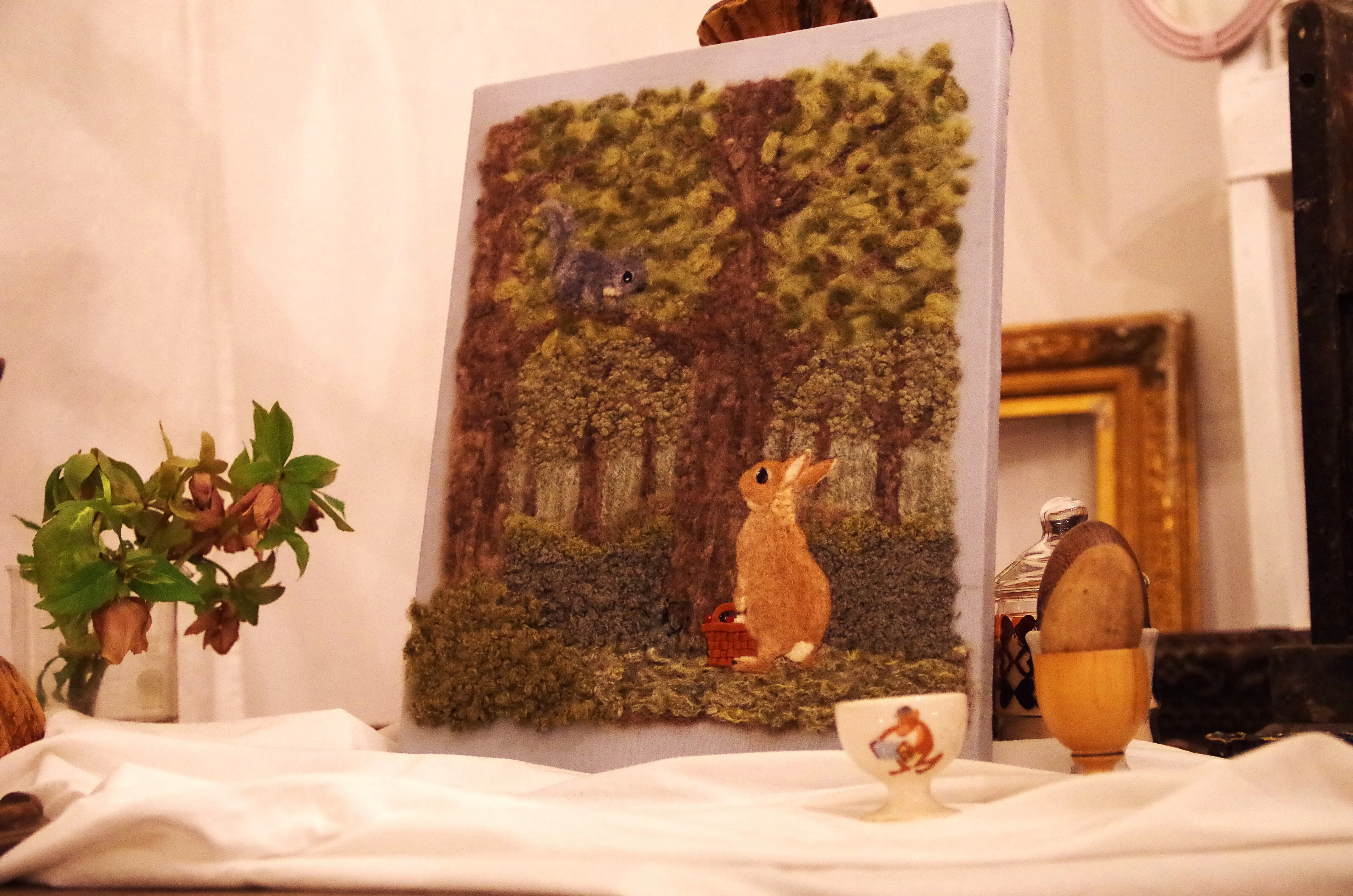 そして、ヒヤシンス雑貨店別館・おやすみブックスにて同時開催されていた、羊毛フェルト画の絵本『やさしい森』の原画展は、おかげさまで 4/16まで延長になりました!