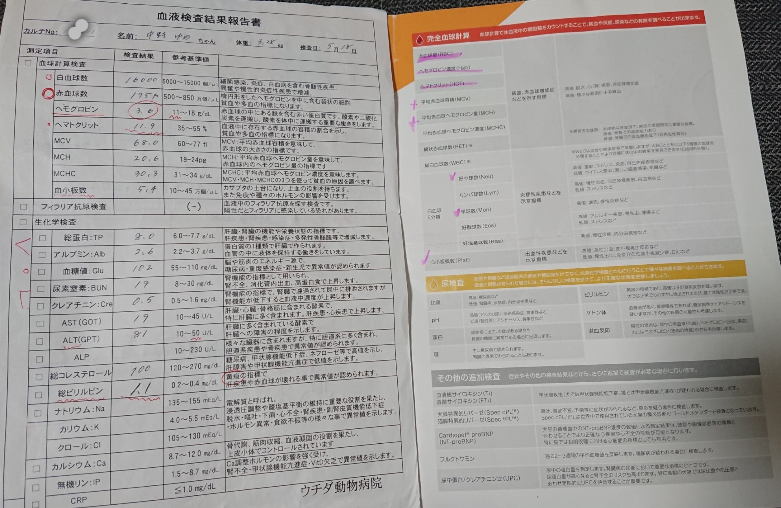 投薬してもあまり効果の薄い物もあり、ようやく今の薬で数値が上がり、継続して数値が上がった状態が確認できました。それでもヘマトクリットは25以上の数値が出てはまた25を下回る状態の繰り返しでした。