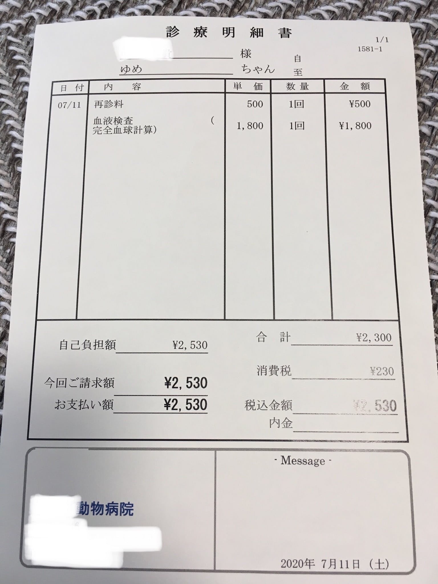 今回の検査費の領収書です。