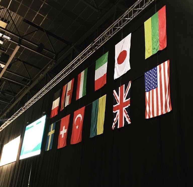 大会会場であるザクセンアリーナのステージの後ろには参加国の国旗がズラリ。モニターの向こう側にも並んでいます。