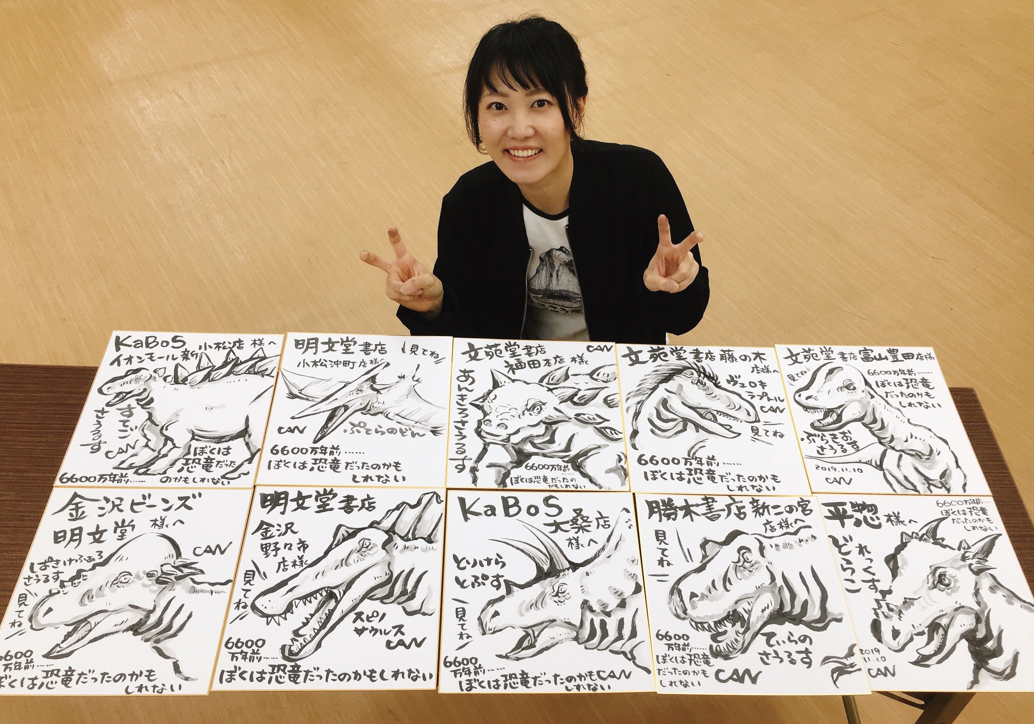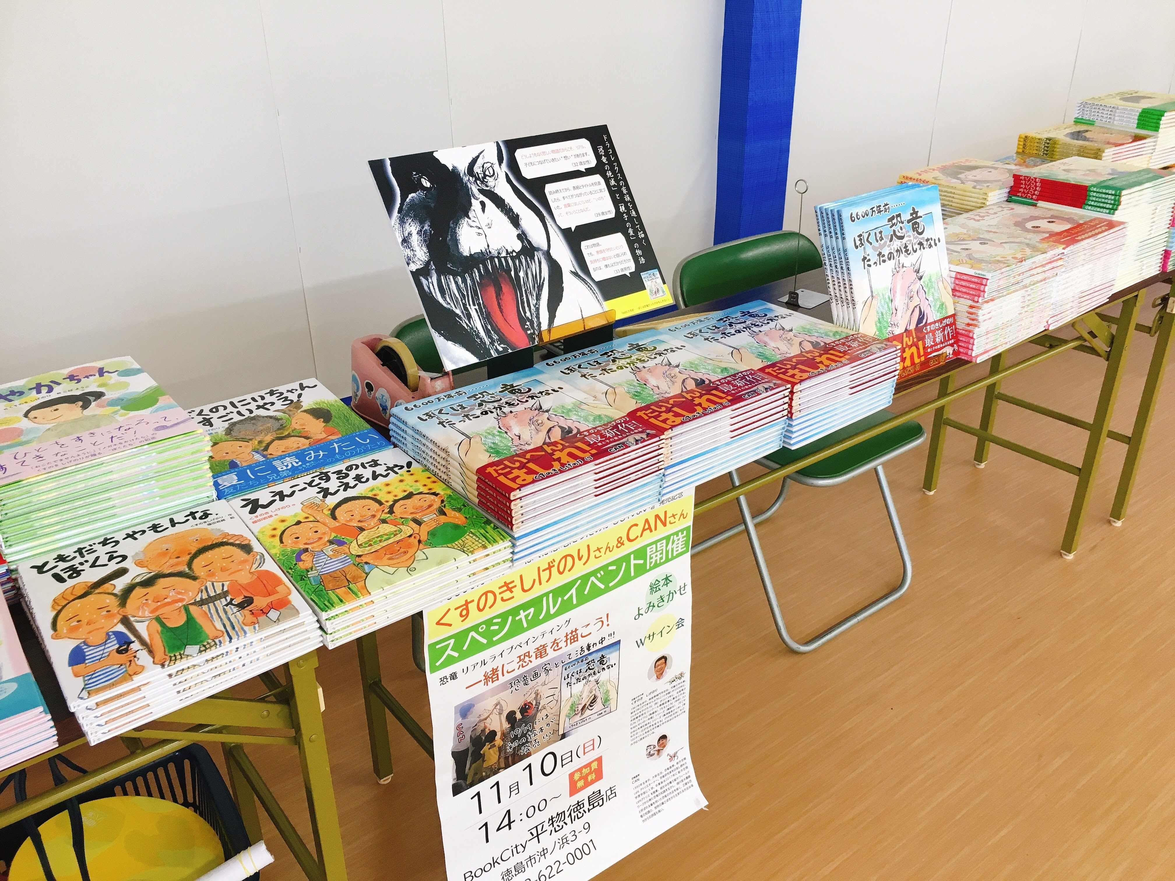 色紙と絵本のサイン、合わせて100匹以上の恐竜を描きました〜。そして恐竜絵本「6600万年前・・・・・・ぼくは恐竜だったのかもしれない」の読み聞かせもしました♪