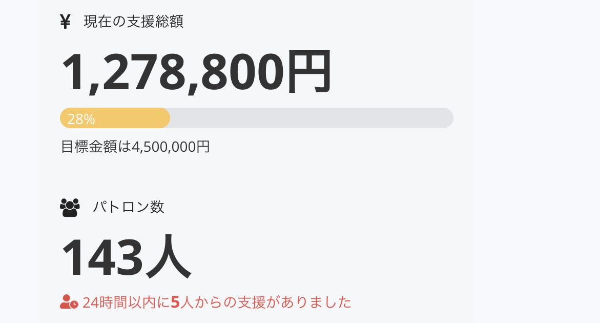 皆さまのおかげで140名以上の方にご支援をいただきまして、目標金額の28%が集まっております!