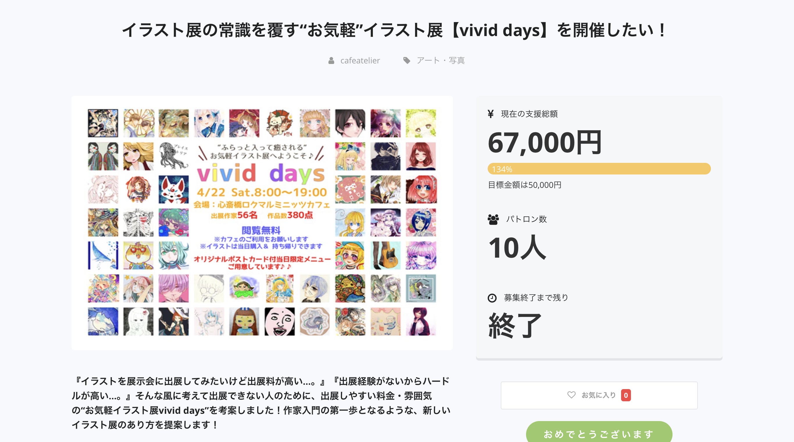 その名も「お気軽イラスト展vivid days」出展料を非常に安く抑え、初展示の人もウェルカム!な展示会にしました。(とはいっても、私自身初の展示会主催でしたので苦労しましたが…それもいい経験でした!)