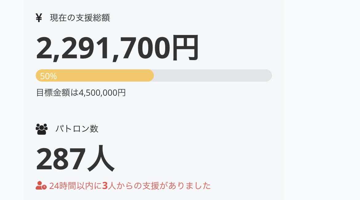 今日も沢山のご支援ありがとうございました!支援者数が287人になりました。複数ご支援くださっている方もいらっしゃるということで、本当にありがとうございます。