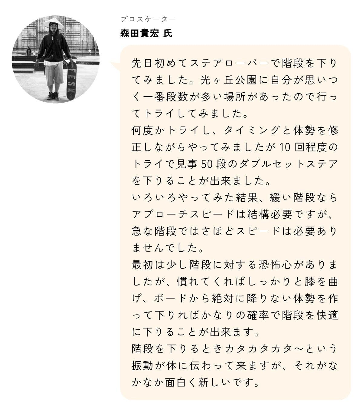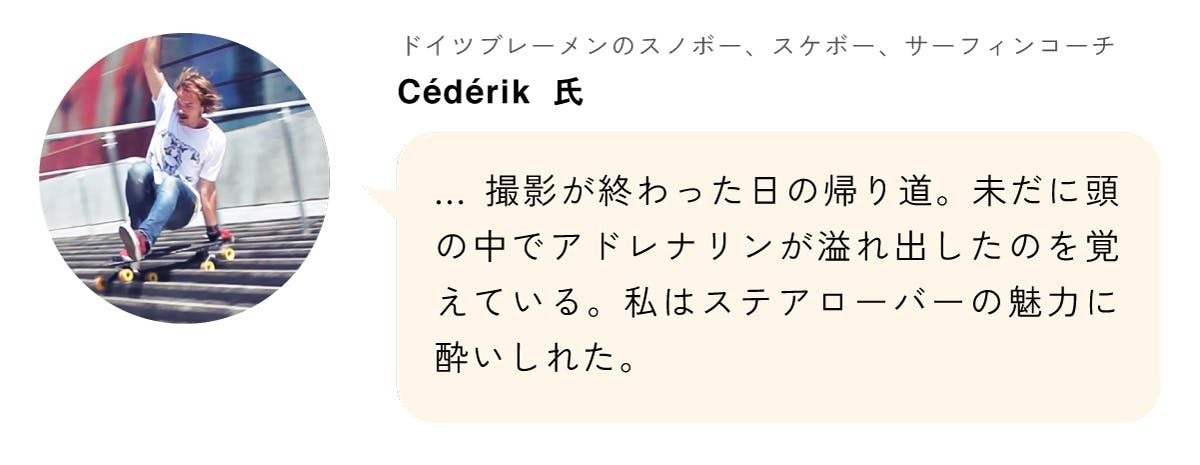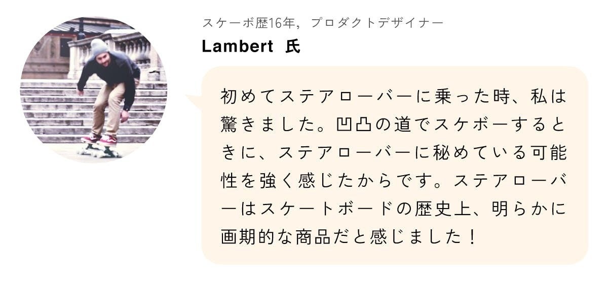 語弊のないように補足しますと、すべてのスケートボードにはそれぞれの特徴があり、遊び方もそれぞれ違うので、ステアローバーが簡単にできないトリックもある反面、ステアローバーにしかできないトリックもあると私たちは考えています。