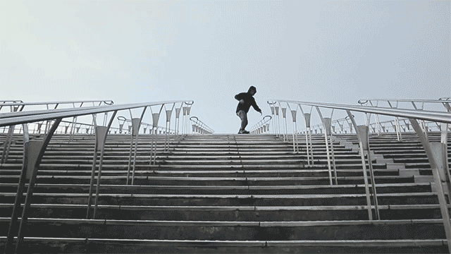 - 階段を降りることは上級者動作です。予想外の怪我や事故にならないため、基本の滑りを習得する前に気軽に試さないでください。