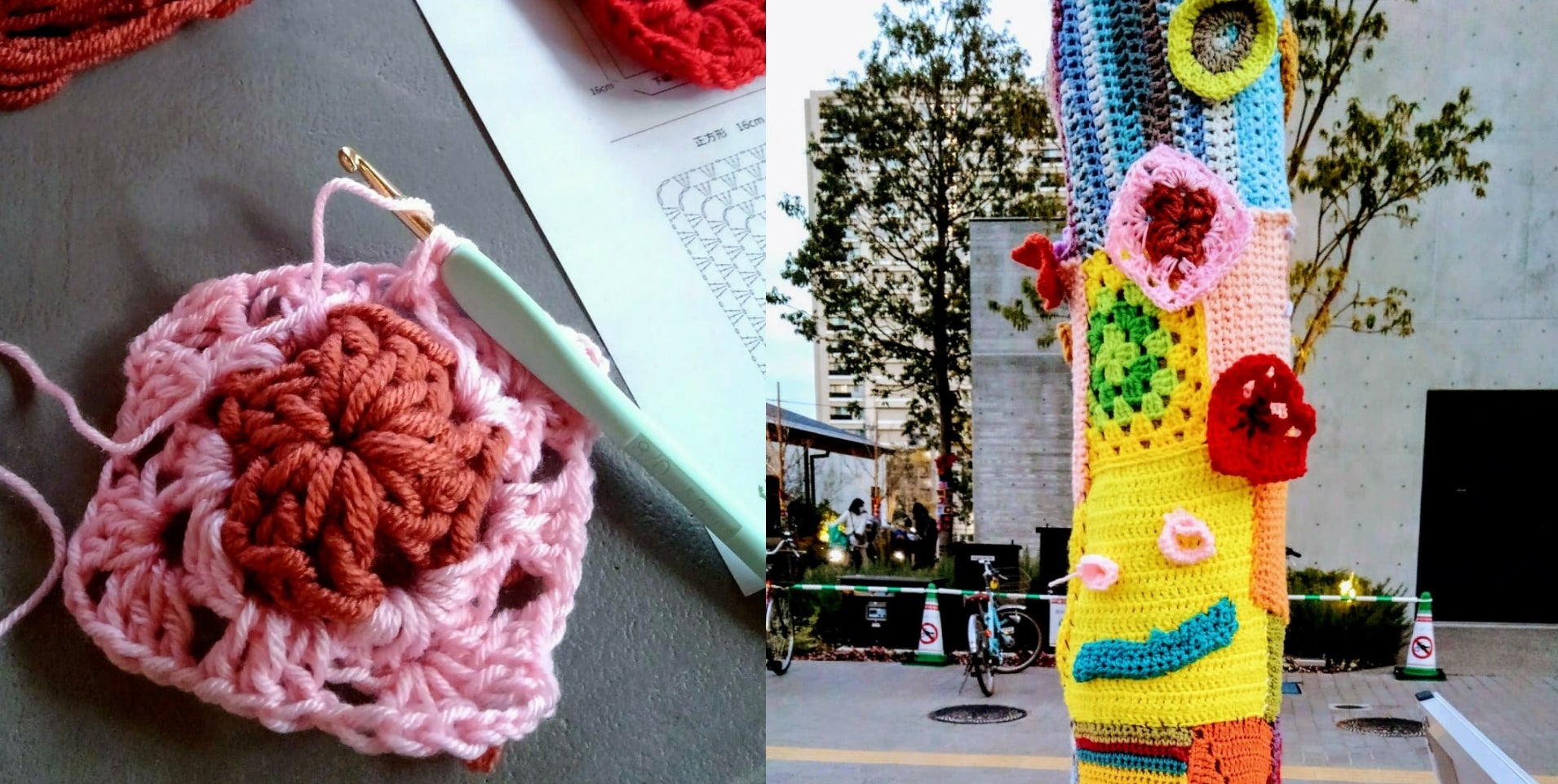 「 としま編んでつなぐまちアート 」は、池袋にちなんだフクロウモチーフなどを参加者で編み繋げて、公園の樹木や立体物を包むヤーンボミングです。