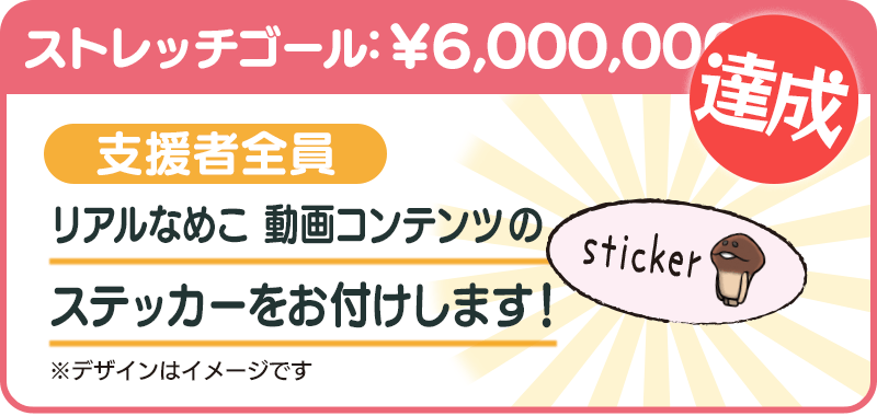 【達成しました!】ご支援いただいた方全員に、身軽になったリアルなめこさんがこれから投稿するであろう「動画コンテンツ」をモチーフにしたステッカーをお付けします。1プランにつきステッカー1枚がリターンに追加されます。