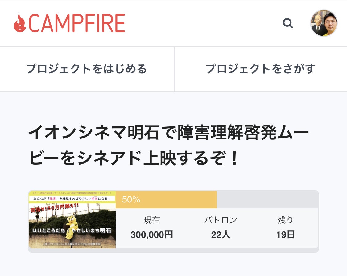 前回の快進撃とまではいきませんが、とうとう本日折り返し地点の30万円に達成しました!!これが早いか遅いかは別として、やはり半分を超えることは非常に嬉しいことです♪引き続き、ご支援していただいた方の字幕をイオンシネマ明石で5秒間映したい!障害当事者の方々が協力していただいた明石のPR動画をシネアド上映したい!たくさんの方に啓発映像を見てもらいたい!と3つの「したい」を叶えるべく頑張っていきたいと思いますので皆様、残りの19日間宜しくお願い致します!!