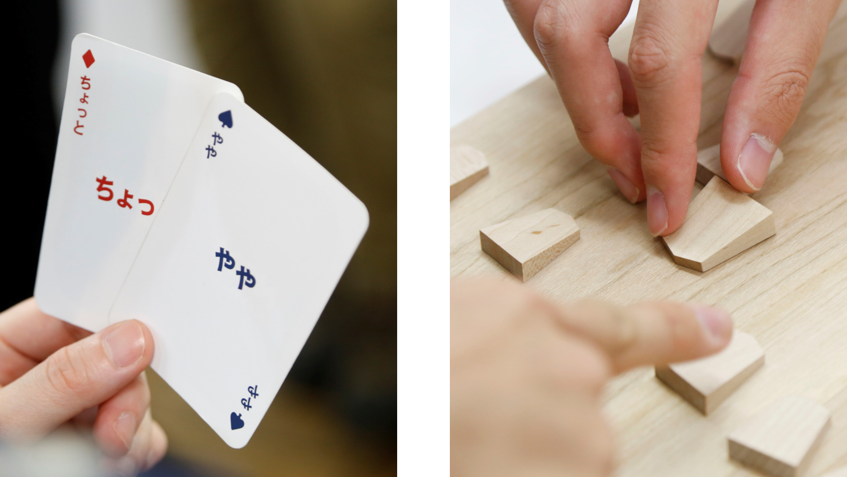 曖昧な言葉の書いてあるカードを使う遊びと、マス目が無い盤を使う遊び。