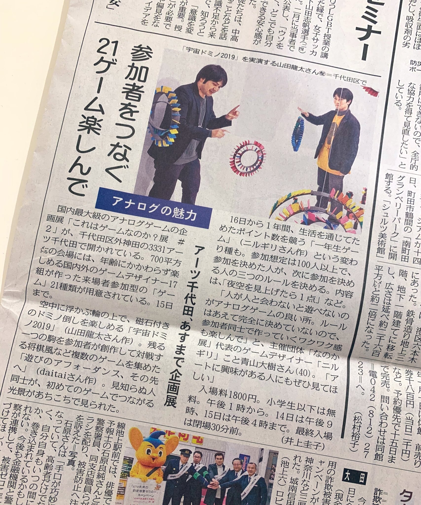 これはゲームなのか?展#2も残り2日。連日大勢のお客様にお越しいただき、ルールの揺らぐ体験をお楽しみいただいています。これもご支援いただいた皆様のおかげです。ありがとうございます。東京新聞に掲載されましたそんな「これはゲームなのか?展」が本日12月14日の東京新聞の朝刊に掲載されました。第1回の「点」からはじまった展覧会を「線」とするために開いた第2回を、このように知っていただける機会を頂戴し、とても光栄です。ご来場者のみなさんからいただくSNSのご感想も批評として、励みとして拝読させていただいています。今後のニューヨークの巡回展など、これからのこれはゲームなのか?展にご期待ください。開催時間変更のお知らせこれはゲームなのか?展は残り2日となりましたが、より多くの方にお楽しみいただくために開催時間を変更致しました。12月14日(土)は21時まで、12月15日(日)は18時までそれぞれ延長となります。突然の変更となり申し訳ございません。気になることがございましたら、CAMPFIREのメッセージにてお問い合わせください。これはゲームなのか?展ガイドブック、できましたこれから来場される方に向けて、作品紹介などを本展覧会の情報をまとめた「これはゲームなのか?展ガイドブック」をnoteにて公開しています。■これはゲームなのか?展ガイドブックこれひとつでこれはゲームなのか?展の魅力がまるっとわかる記事となっています。ご来場のおともに、ご友人への紹介にどうぞご活用ください。ギャラリートークなのか鼎談、閉幕平日の夜に様々なジャンルのゲストをお招きしてお送りしたギャラリートーク「なのか鼎談」。残念ながら12月13日の第5夜をもって終了してしまいましたが、登壇者の皆さんの知識と経験の上に立った鋭くも深いトークや、ユーモアある内容にご来場のみなさんは楽しまれていたようです。トーク内容の公開の予定は現在のところございませんが、当日の実況をTwitterにて投稿しています。ハッシュタグ「#なのか鼎談」にて、お客様の感想やスタッフによる実況をご覧いただけますので、気になる方はぜひご覧ください。これはゲームなのか?展#2も、残すところ2日となりました。残りの期間もゲームとアートについてみなさんに問いかけることができれば幸いです。引き続き「これはゲームなのか?展」をよろしくお願いいたします。