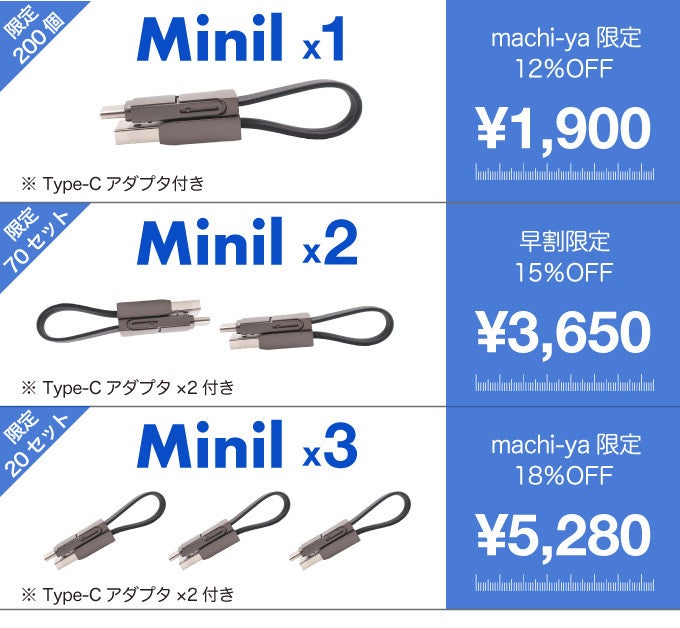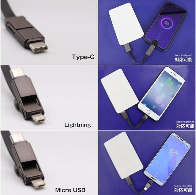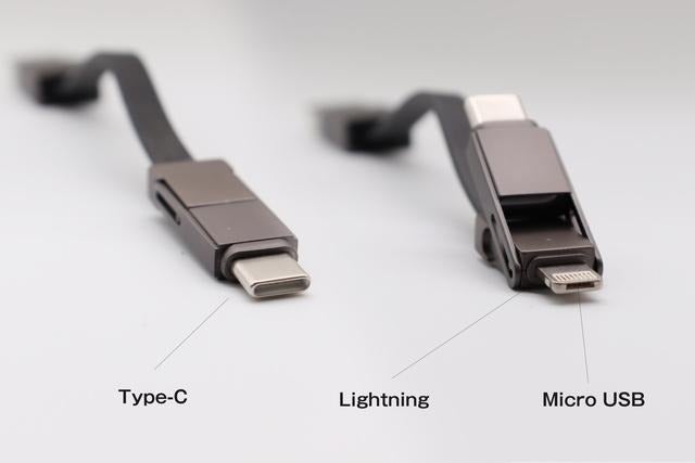 そこで「ミニル」は3in1を採用。iPhone用のLightning、Androidやアクセサリー類に多いMicro USBと勢力を拡大しつつあるType-Cの全てをこのサイズに搭載することにしたのです。