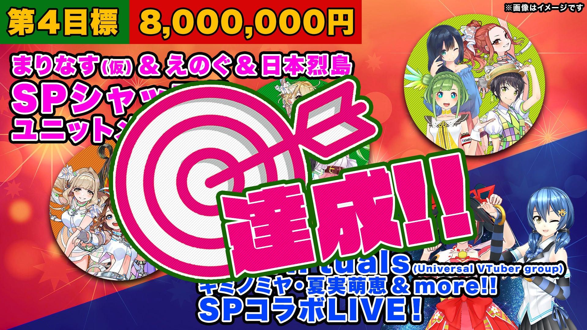 第4目標の800万円に達したら、まりなす(仮)、えのぐ、日本烈島のアイドルユニット3組が音楽LIVEで一夜限りのシャッフルユニット結成!オリジナルメドレーを披露いたします。また、キミノミヤがオーガナイズする世界各地のVTuberを集めたユニット「UniVirtuals」が名古屋に集結!人気のアニメソングを英語ver.で歌いあげます。詳細は、当日までのお楽しみ!