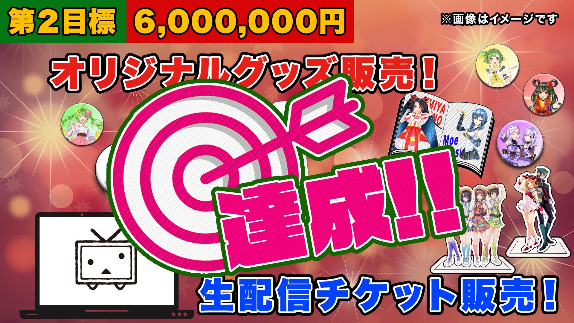 第2目標の600万円に達したら、「ナゴヤVTuberまつり」のオリジナルグッズを会場で販売します。さらに、ステージの模様を生配信&アーカイブ配信いたします。グッズの詳細や生配信チケットの購入方法などは、追ってこちらのページにて発表いたします。