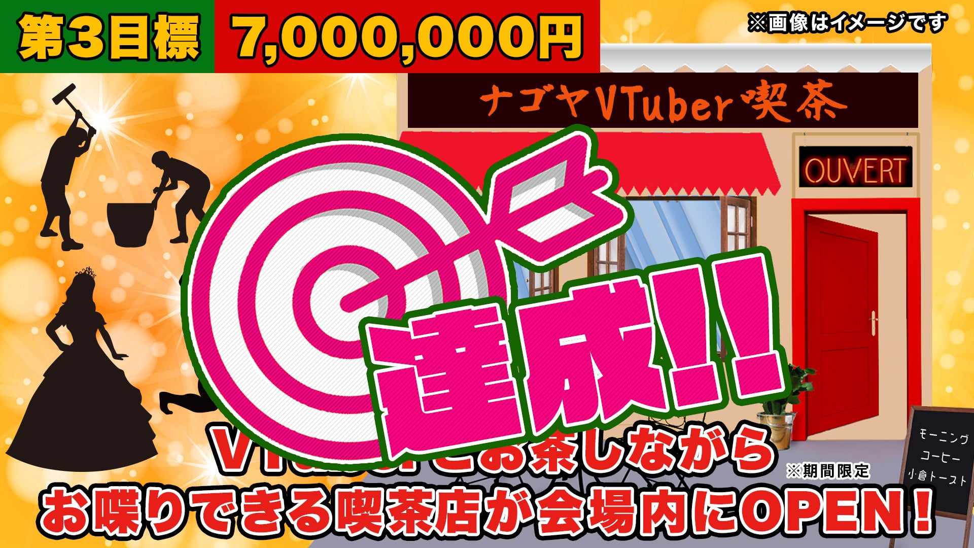 第3目標の700万円に達したら、ステージ出演者以外にも、VTuberと触れ合えるスペースとして、「ナゴヤVTuber喫茶」を会場内に期間限定でオープンいたします。喫茶店に登場する新規VTuberは、追ってこちらのページにて発表いたします。