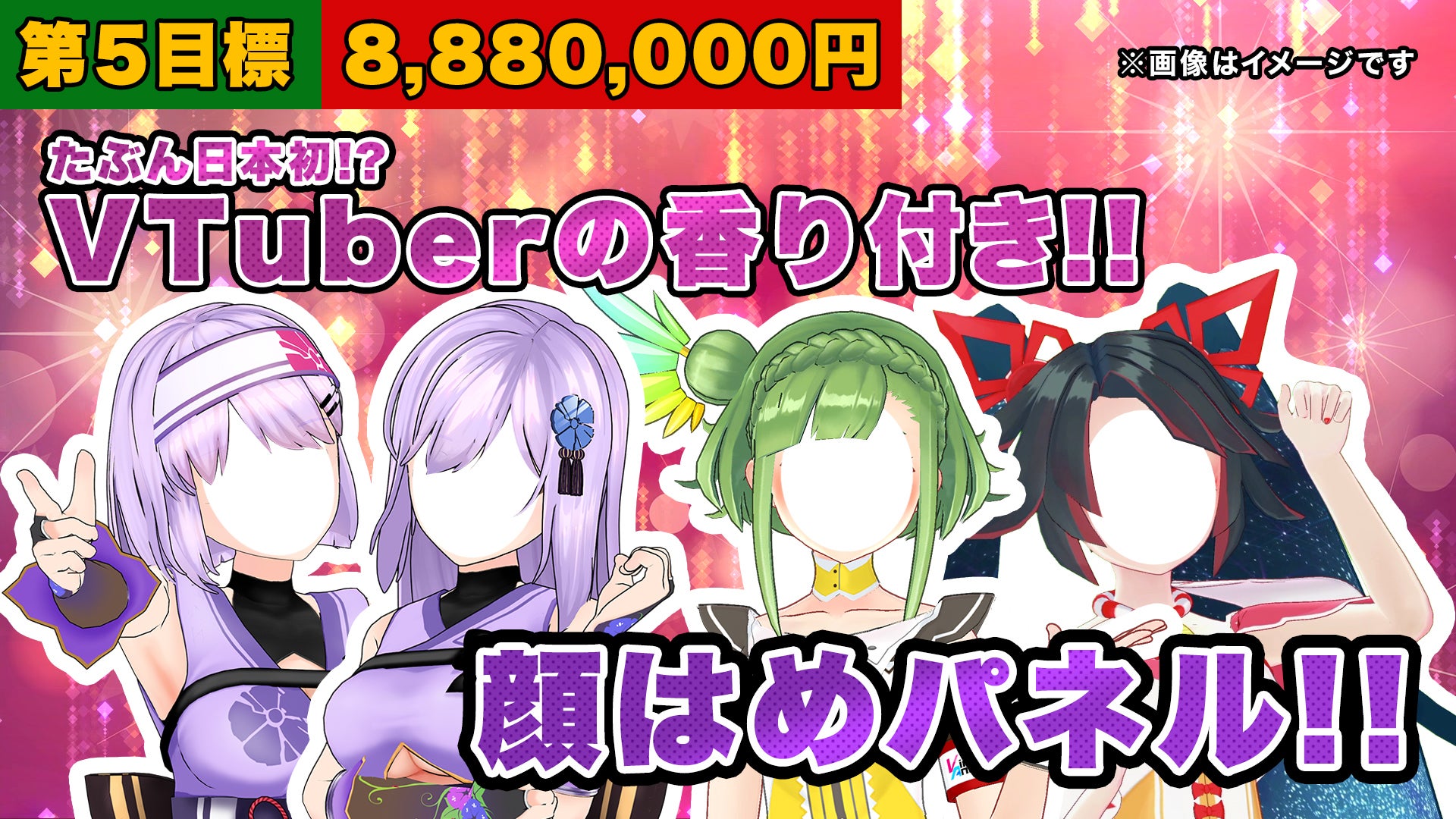 第5目標の888万円に達したら、朝ノ姉妹さんのアイデアをヒントに考案した「VTuberの香り付き顔はめパネル」を会場に設置いたします。おそらく日本初の試みなのでは!?大好きな推しの香りを身にまとって、まるで自分自身が推しになってしまったかのような気分になれる夢の空間を作り出します。どの参加VTuberのパネルが設置されるかは、当日までのお楽しみ!良い表情でたくさん写真を撮って頂けたらと思います。
