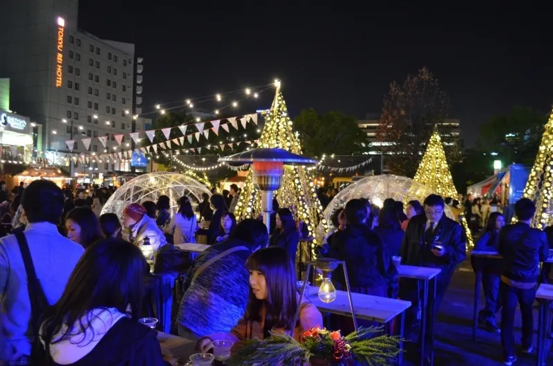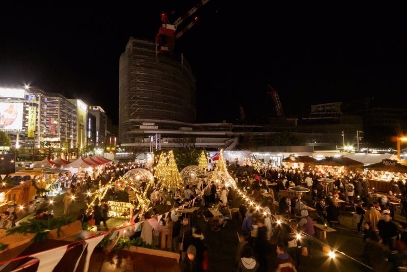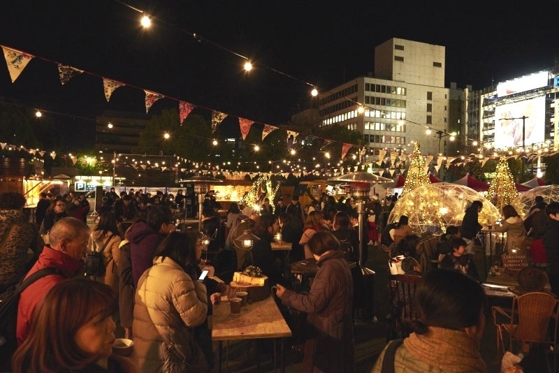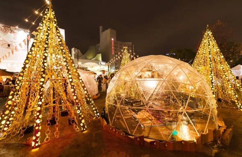 熊本のシンボルである “竹あかり” のクリスマスツリーや、暖かい飲み物や食べもの、熊本県産材を使った木製の店舗小屋 “ヒュッテ” に、ラグジュアリーなドームテント “ガーデンイグルー“ etc.