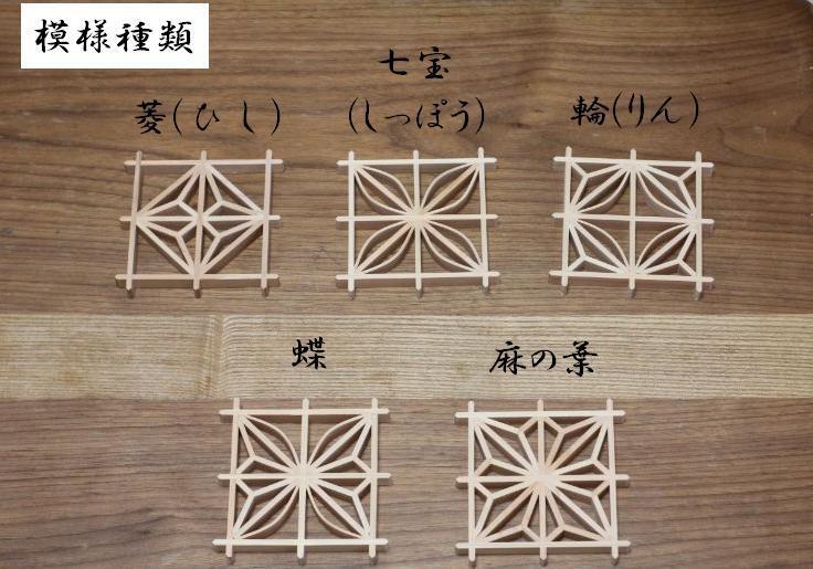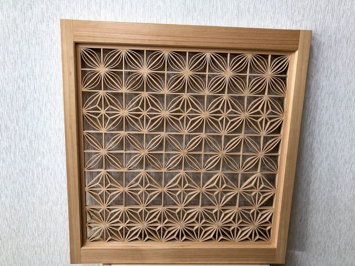 この作品は組子細工では代表的な作品だと思いますが、高知県産のヒノキを使用し組子細工という工法で作成しており、一つ一つ削った各パーツの木を組み合わせて模様を作っています。