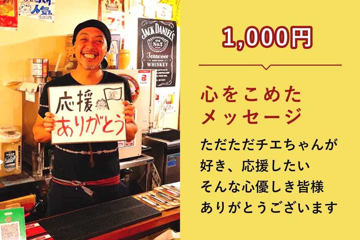 チエちゃんの会員に!?お店に手作りの応援旗をつくります。その旗にご支援いただきました方のお名前またはニックネームを書かせていただきます。書いてほしい名前の指定をお願いいたします。