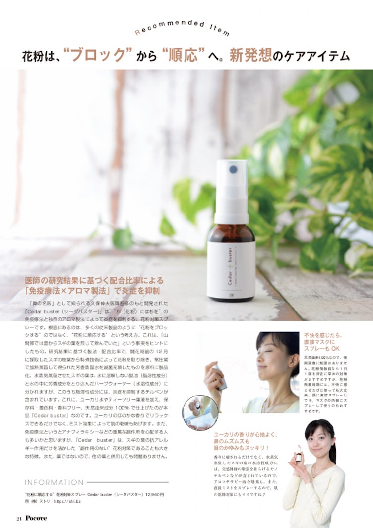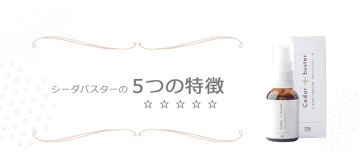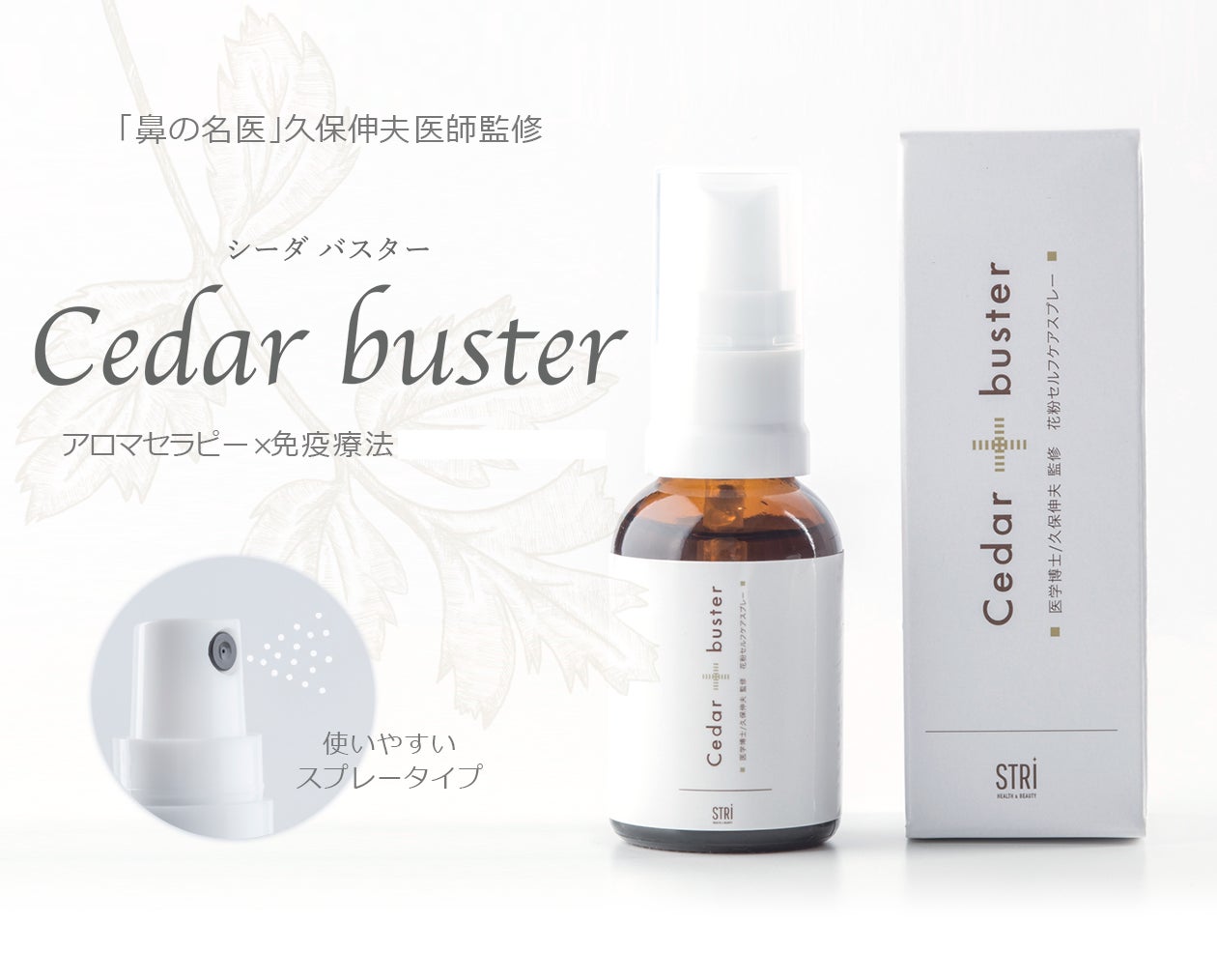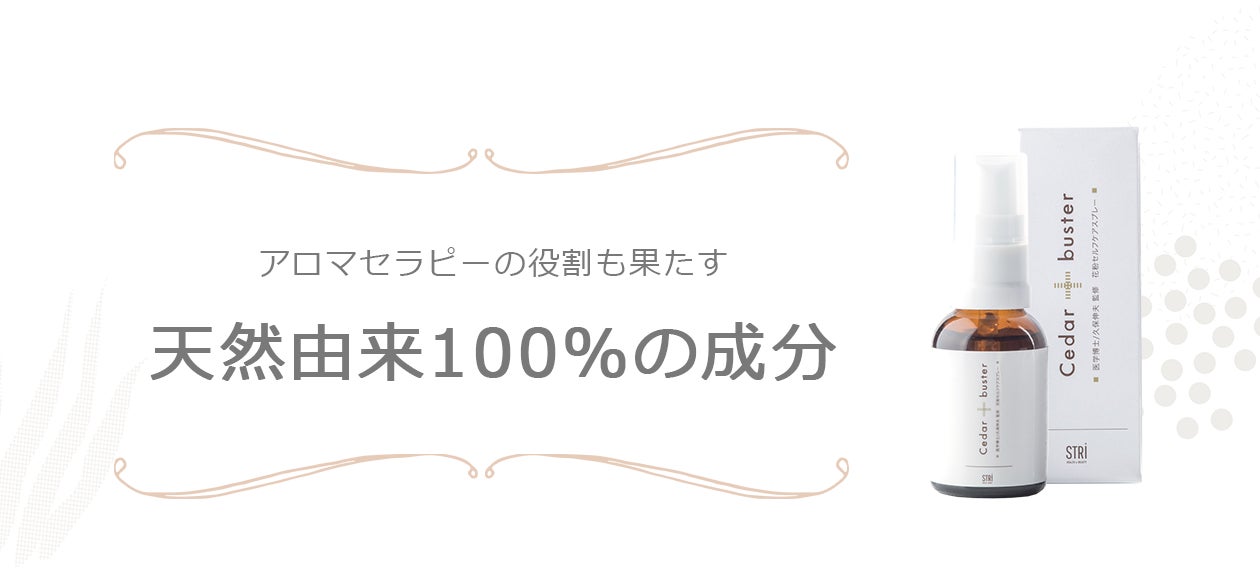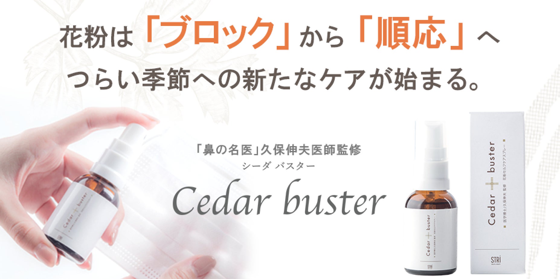 Ceder busterは 「鼻の名医」久保伸夫医師監修のもと開発された、 杉の「葉」の部分に発見された抗アレルギー作用と山間部の先人の知恵に着目した新発想の花粉対策スプレーです。