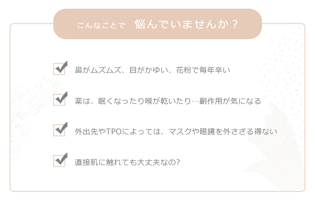 従来製品に多く見られる、花粉を「ブロック」するという常識を覆し、「花粉に順応する」という考え方で不快な時期を快適にサポートします。 また、久保医師の研究結果に基づく独自の製法により、 従来の免疫療法のデメリットであるアナフィラキシーなどのリスクを無くし、 副作用のない花粉対策を実現しました。 使用者の7割が改善を実感した、新しい花粉症セルフケアの形です。