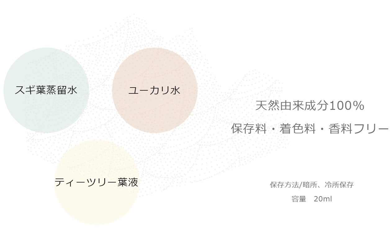 毎年開花期前の年に1度だけ採取した杉の枝葉から特殊技術で花粉を取り除き、常圧釜で加熱蒸留して得られた芳香蒸留水を滅菌充填した点鼻・顔用スプレーです。静岡県袋井市で採取した時期に久保医師監修のもと、作られます。今期は限定500本です。