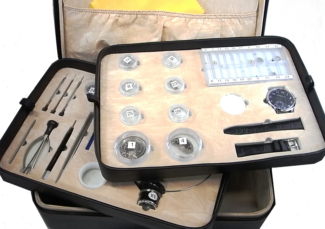 キャリーバッグには必要なすべての物が収納されています。具体的には、組立に必要な工具類一式、分解されたムーブメント、時計ケース&裏蓋、ダイアル&針一式、ストラップ、組立マニュアル等です。作業スペースさえ確保できれば、このキャリーバッグをもって行ける場所があなたの時計工房になります。