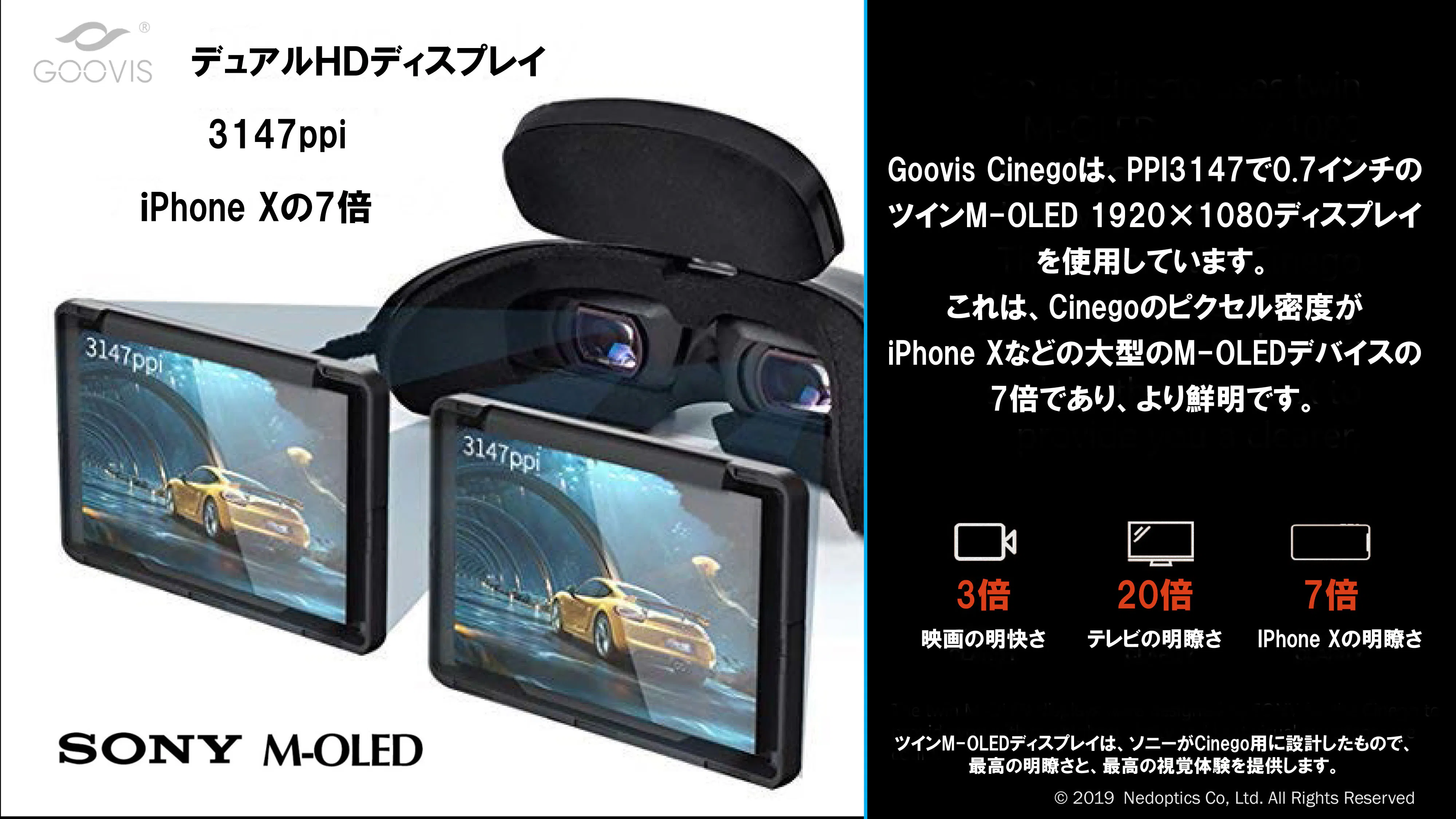 これは、GOOVIS PROがiPhone Xなどの大型M-OLEDデバイスの7倍のピクセル密度を持ち、より鮮明で滑らかで美しい画像を提供することを意味します。