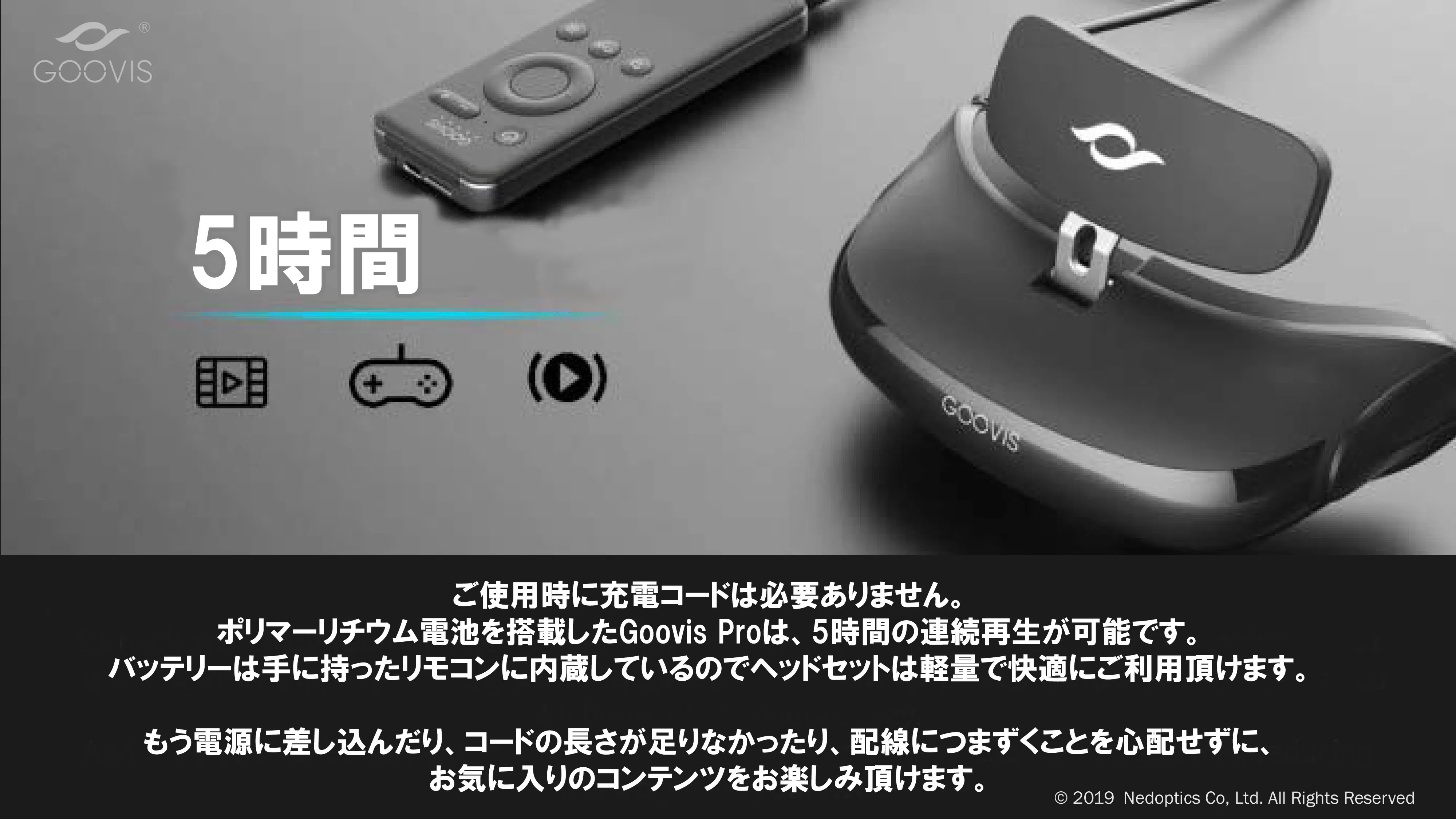 GOOVIS PROのバッテリー稼働は最大5時間と約映画2本分となります。